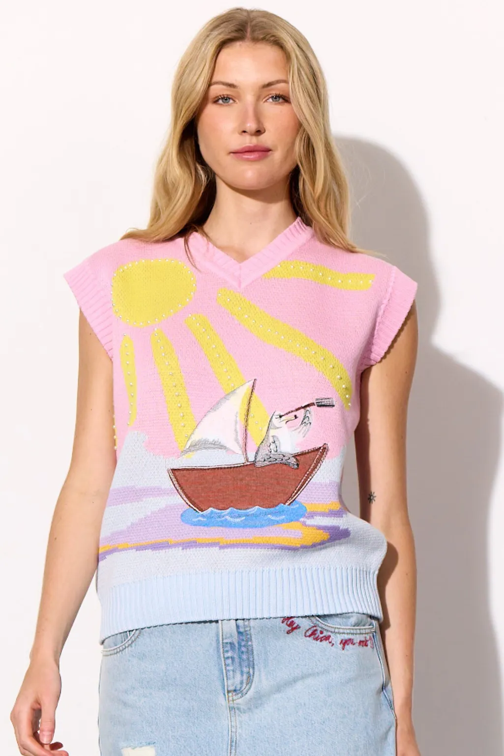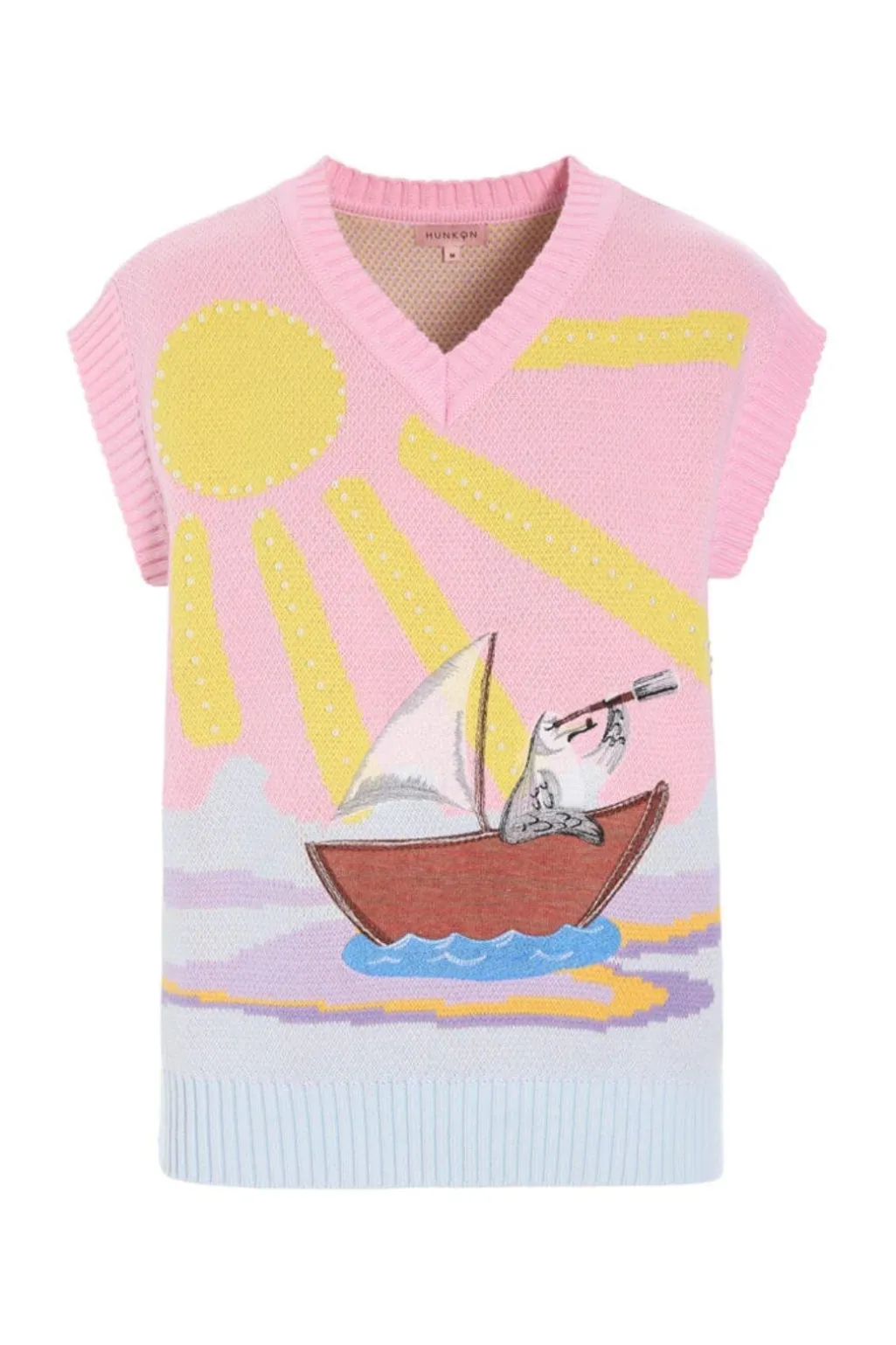 En ærmeløs vest fra Hunkøn i farven Pink Sea med et farverigt mønster af en gul sol og en fugl i en båd.