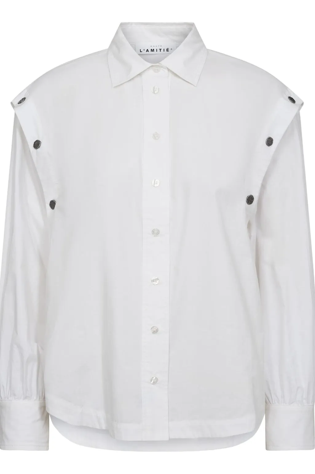 Hvid skjorte fra Haute L’Amitié med knapdetaljer langs ærmerne. Skjorten har en klassisk spids krave og en oversized pasform.
