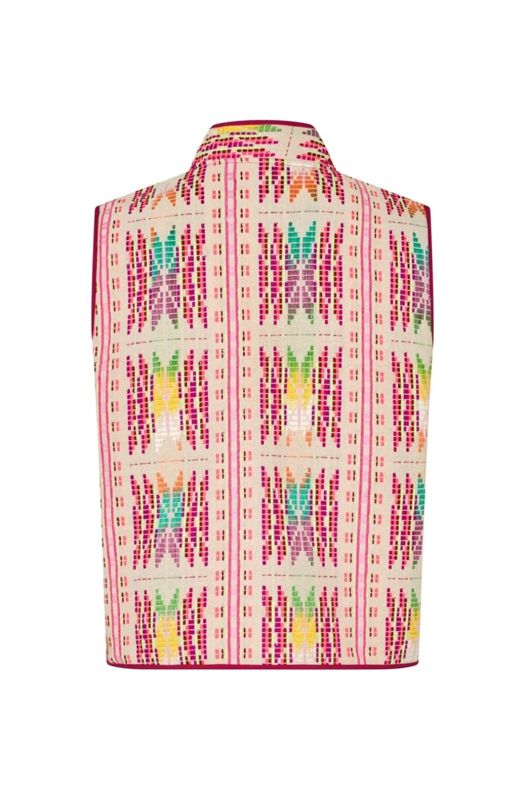 Quiltet vest fra Lollys Laundry med høj krave og knaplukning. Den har et farverigt mønster på lys bund og to praktiske lommer på forsiden.