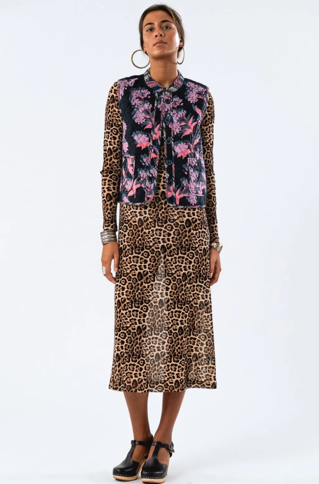 Quiltet vest fra Lollys Laundry med blomstermønster i lyserød og blå på mørk bund. Vesten har høj krave, knaplukning og dekorative syninger gennem hele designet.