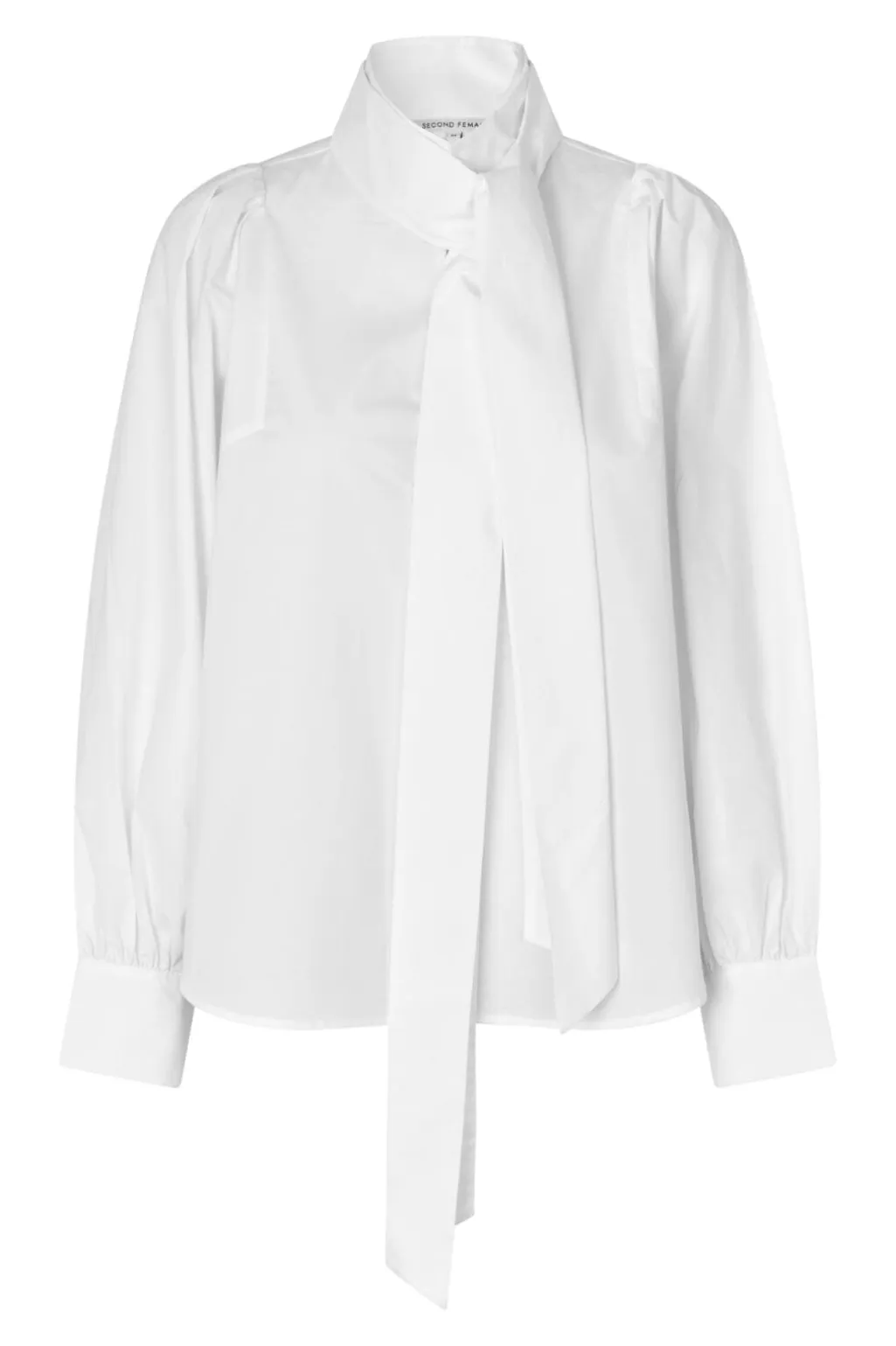 Hvid bluse fra Second Female, lavet af 100 % økologisk bomuld. Blusen har en høj halsudskæring med en lang, aftagelig bindedetalje foran.