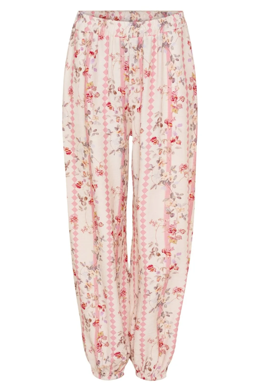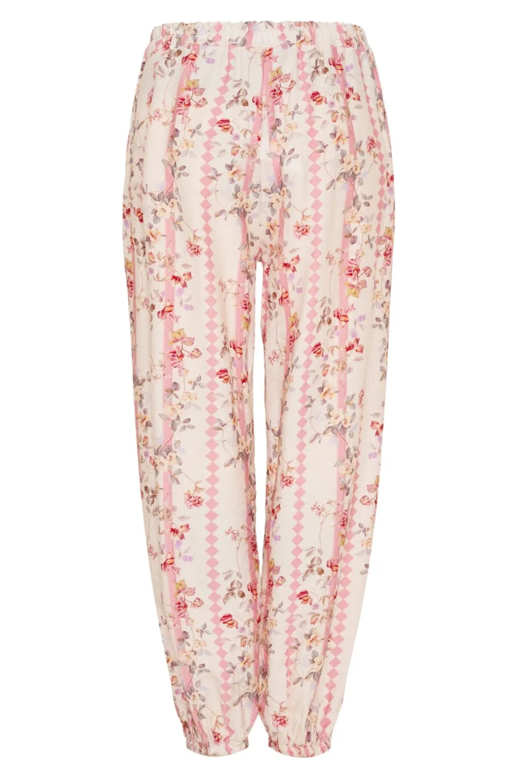 Bukser fra Marta Du Chateau i hvid med blomstermønster i pink og creme nuancer. De har en klassisk pasform og ankellængde med elastiske detaljer.