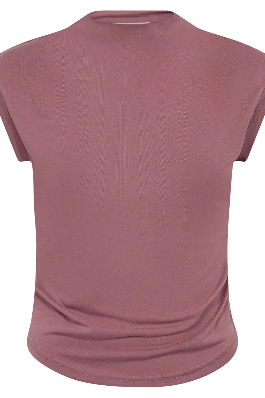 T-shirt fra Co’Couture i en rosenrød nuance. Den har rund halsudskæring og korte cap-ærmer. Materialet er en blød blanding af modal og polyester med et let fald.