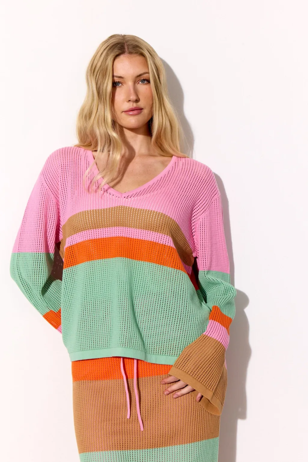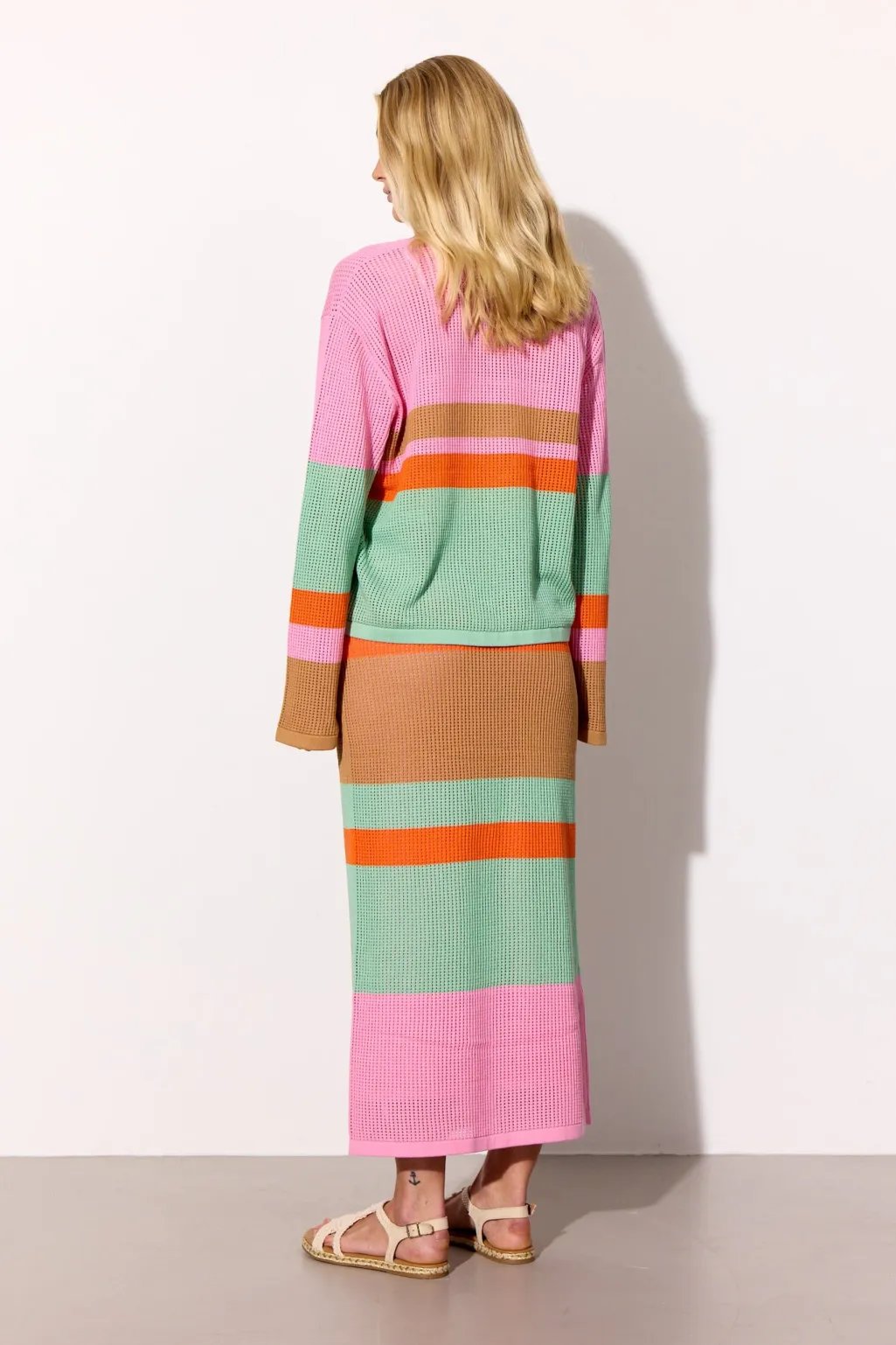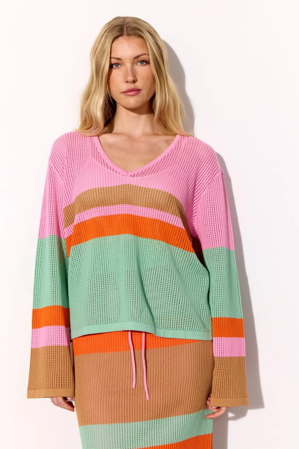 Bluse fra Hunkøn med striber i pink, mintgrøn, orange og brun. Den har en mesh-strikket struktur og en løs pasform.