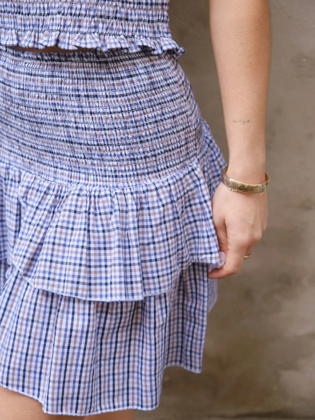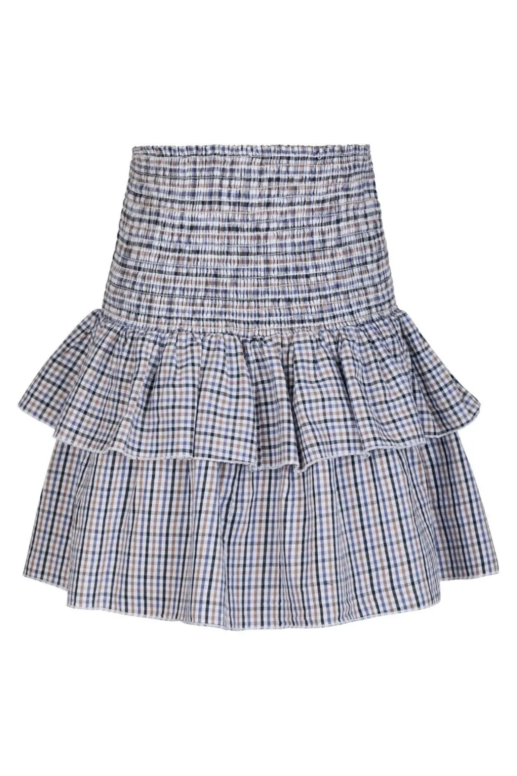 Ternet nederdel fra Neo Noir i blå og hvid. Den har to lag flæser og smockelastik i taljen. Nederdelen går til midt på låret og har et klassisk ternet mønster.