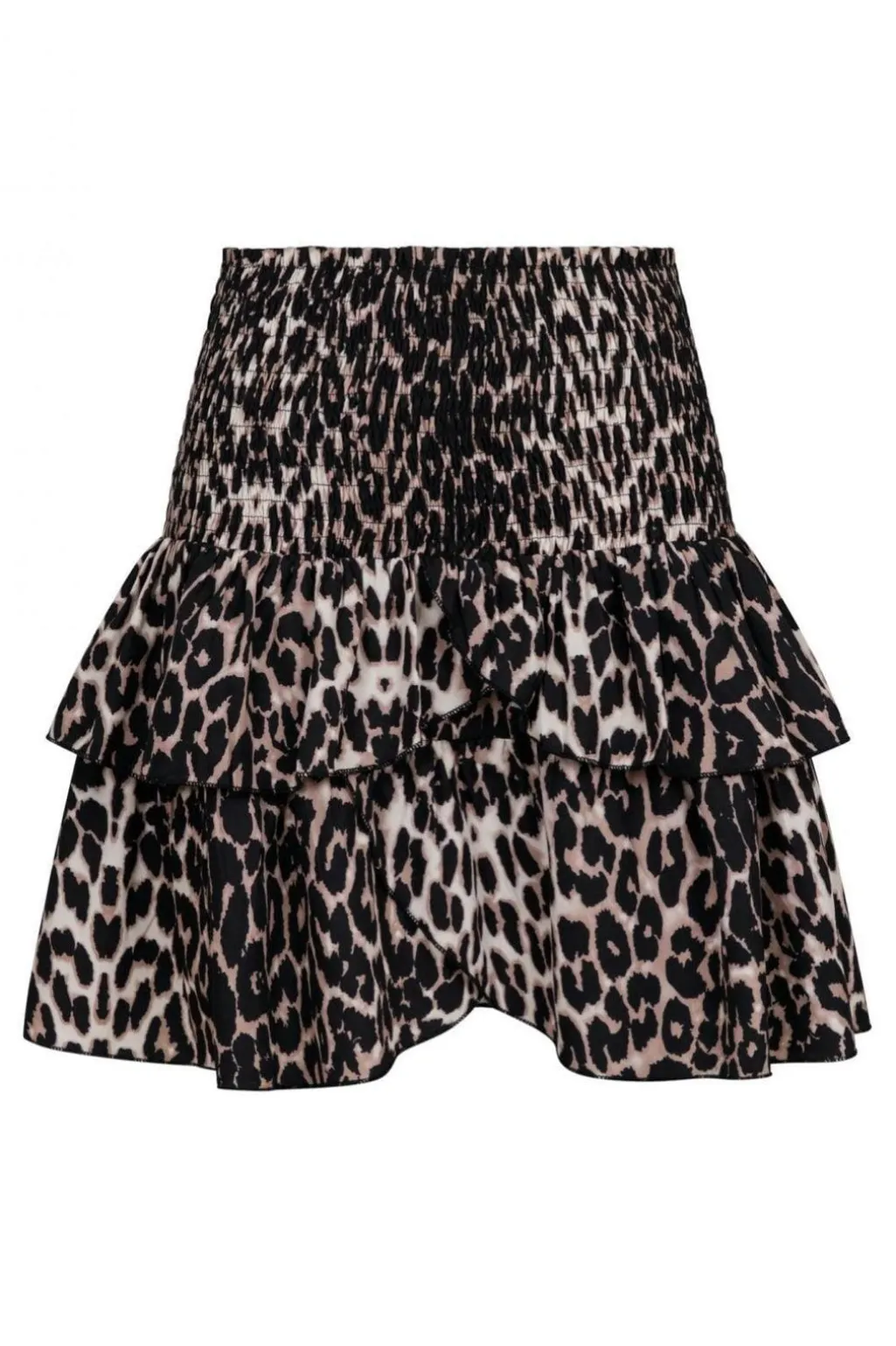 Nederdel fra Neo Noir med leopardmønster i brune og sorte nuancer. Den har smock-elastik i taljen og to lag flæser, der giver bevægelse til designet.