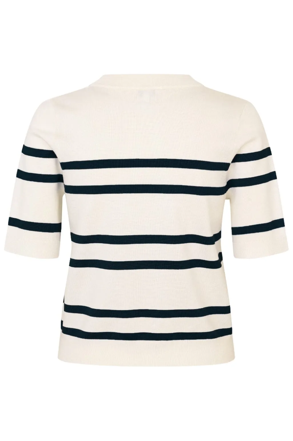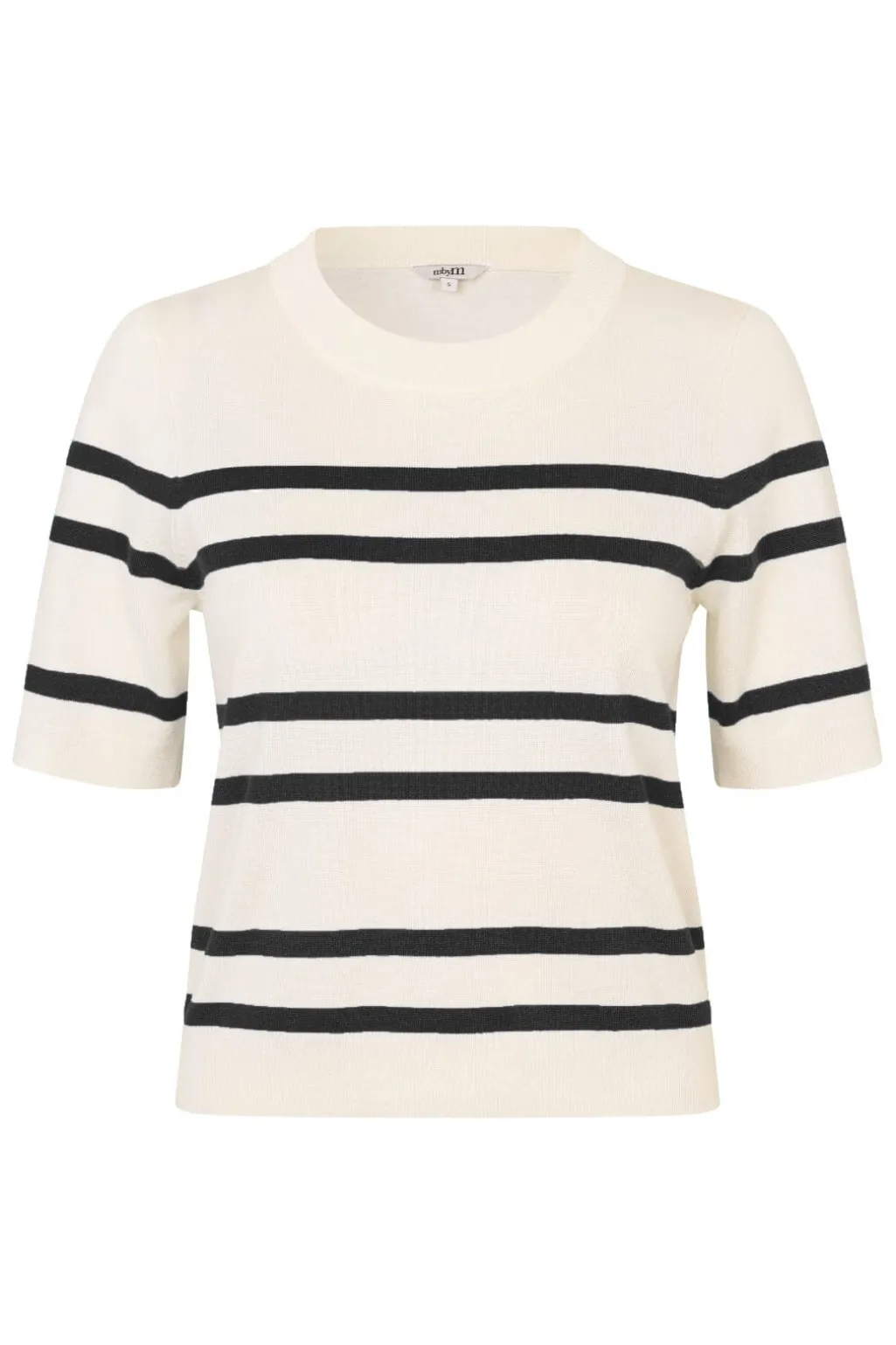 Strikbluse fra MbyM med sorte og hvide striber. Den har rund halsudskæring og korte ærmer. Blusen er fremstillet i et let og åndbart materiale.