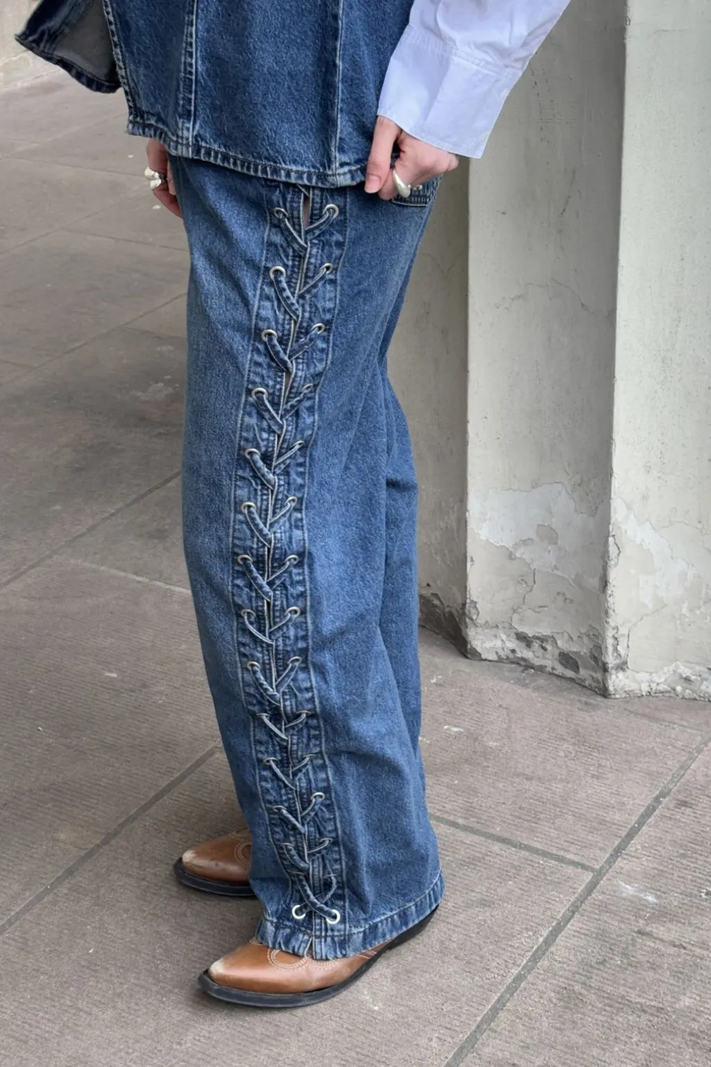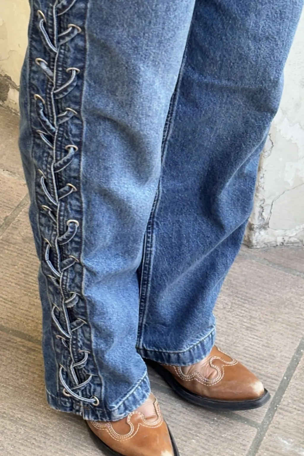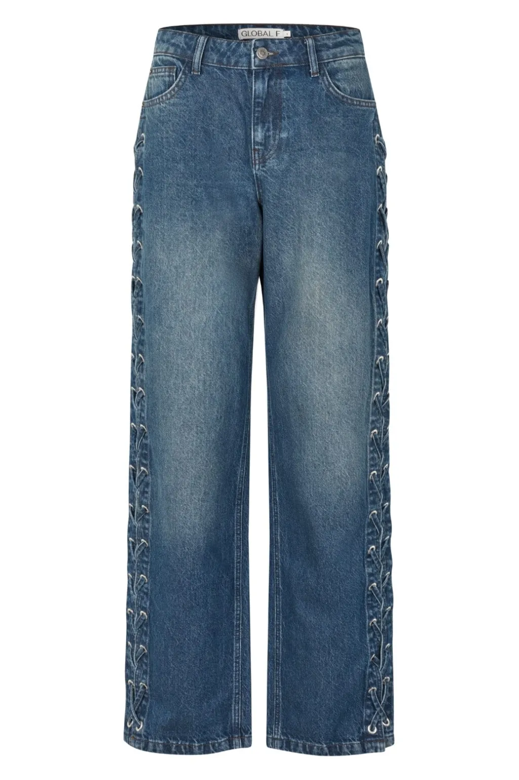 Jeans fra Global Funk med snørredetaljer langs benene. Den blå Mud Stone Wash farve har en acid wash-effekt, der giver jeansene et særegent udseende med lyse og mørke nuancer.