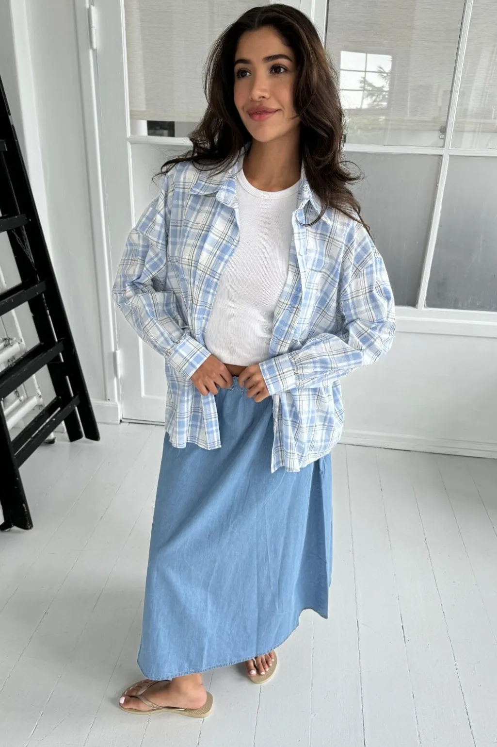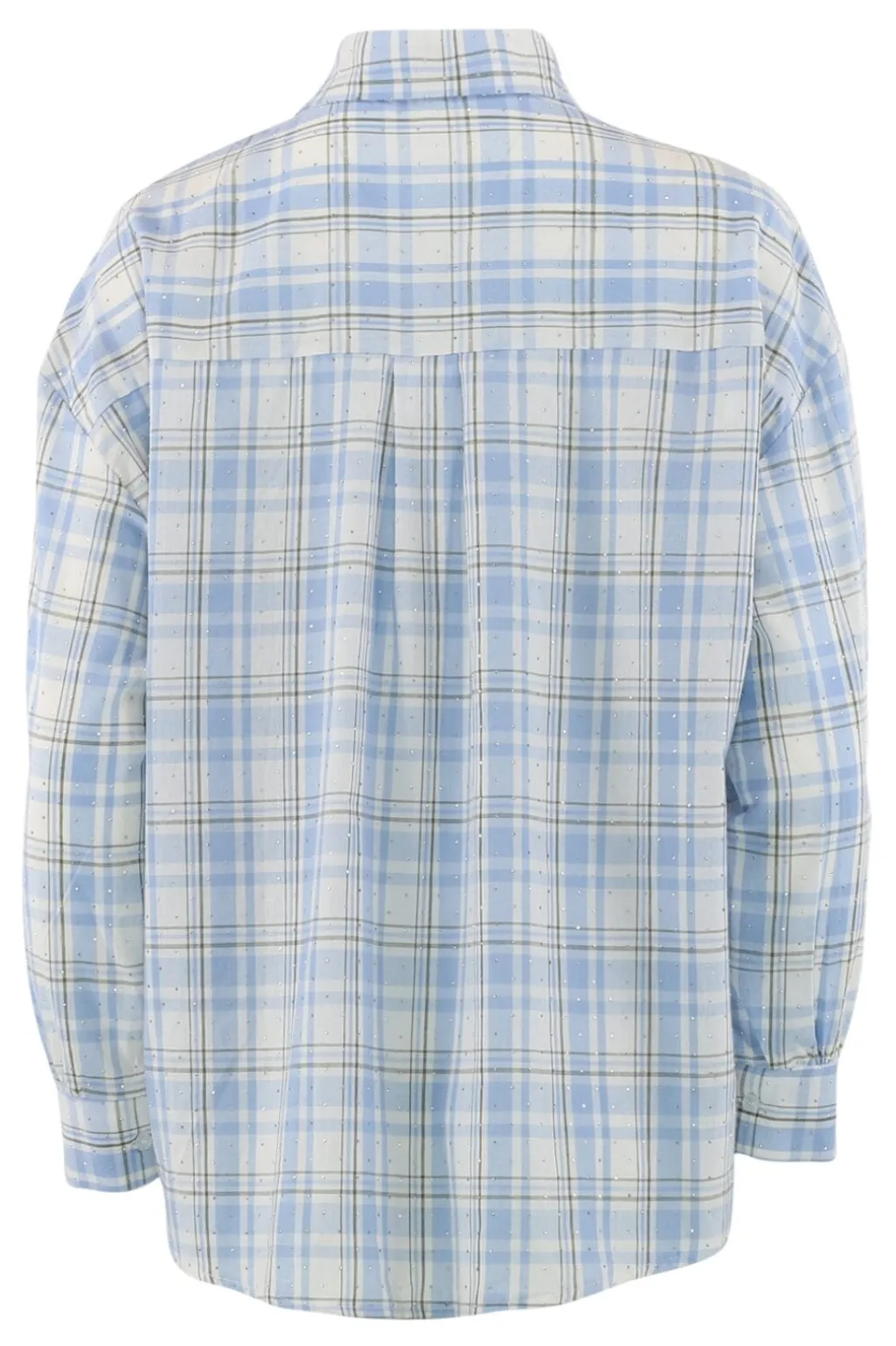 Skjortebluse i lyseblå og hvid tern fra Continue. Den løse pasform og de lange ærmer giver en afslappet stil, mens det klassiske ternede mønster skaber et rent udtryk.