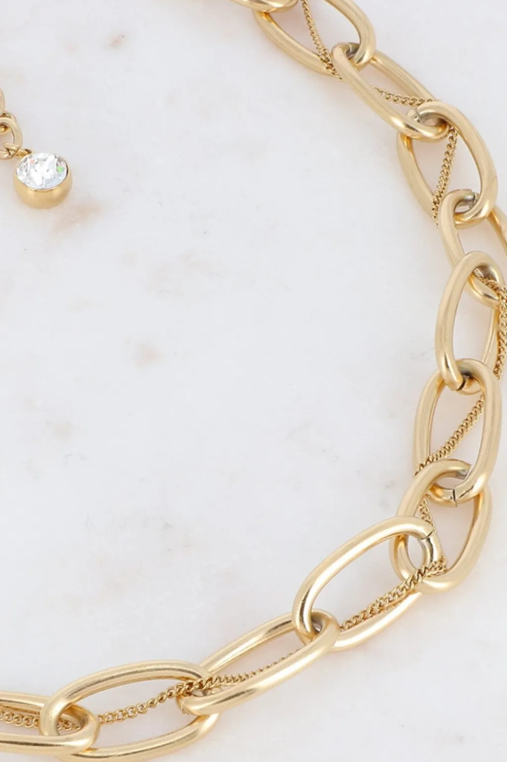 Forgyldt halskæde fra Mellow Moon med store kædelænker og en rund krystalpendant. Halskæden er lavet af rustfrit stål med en gylden finish.