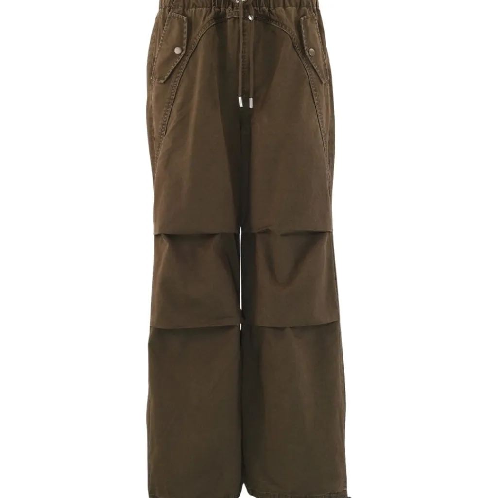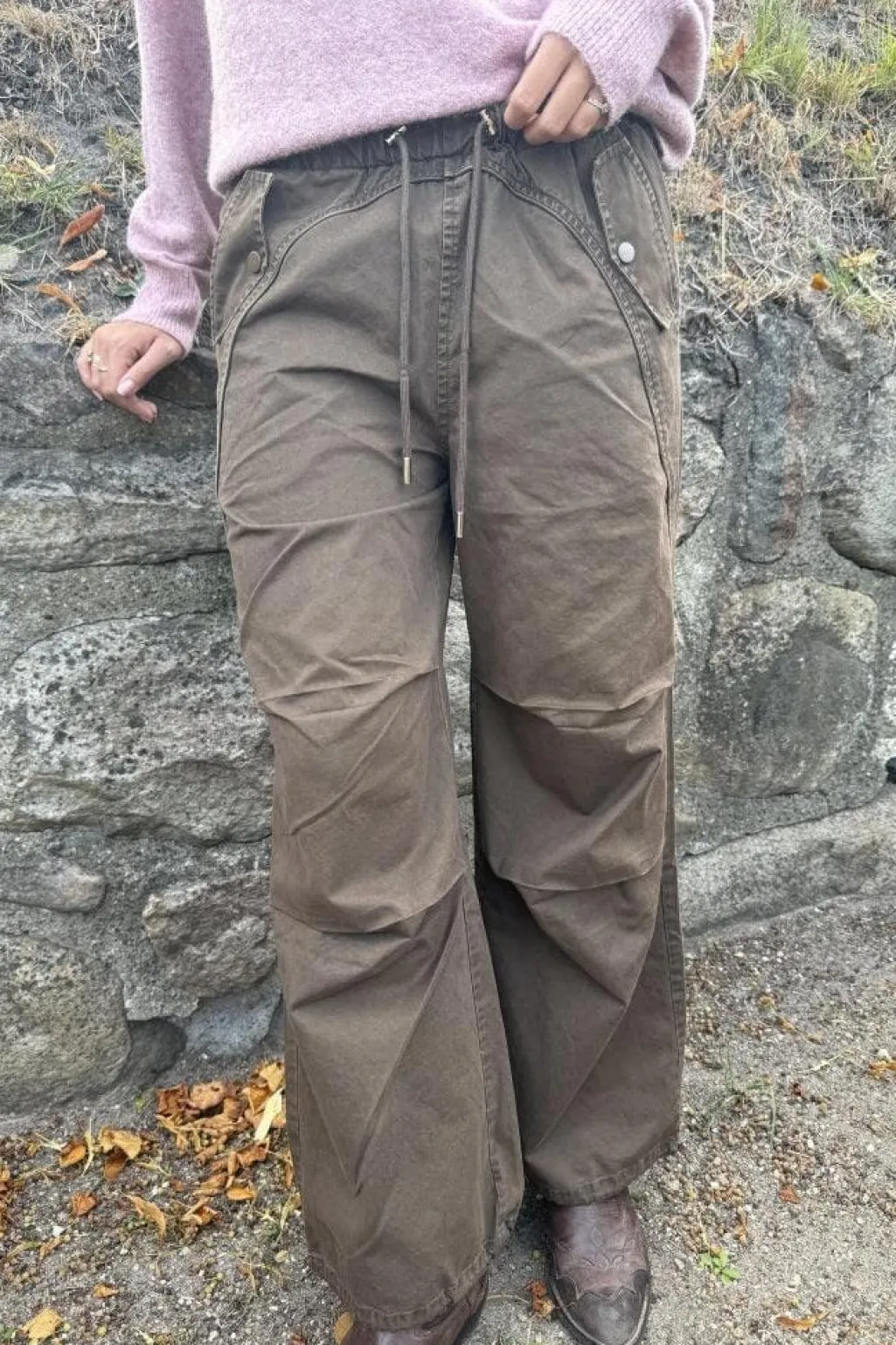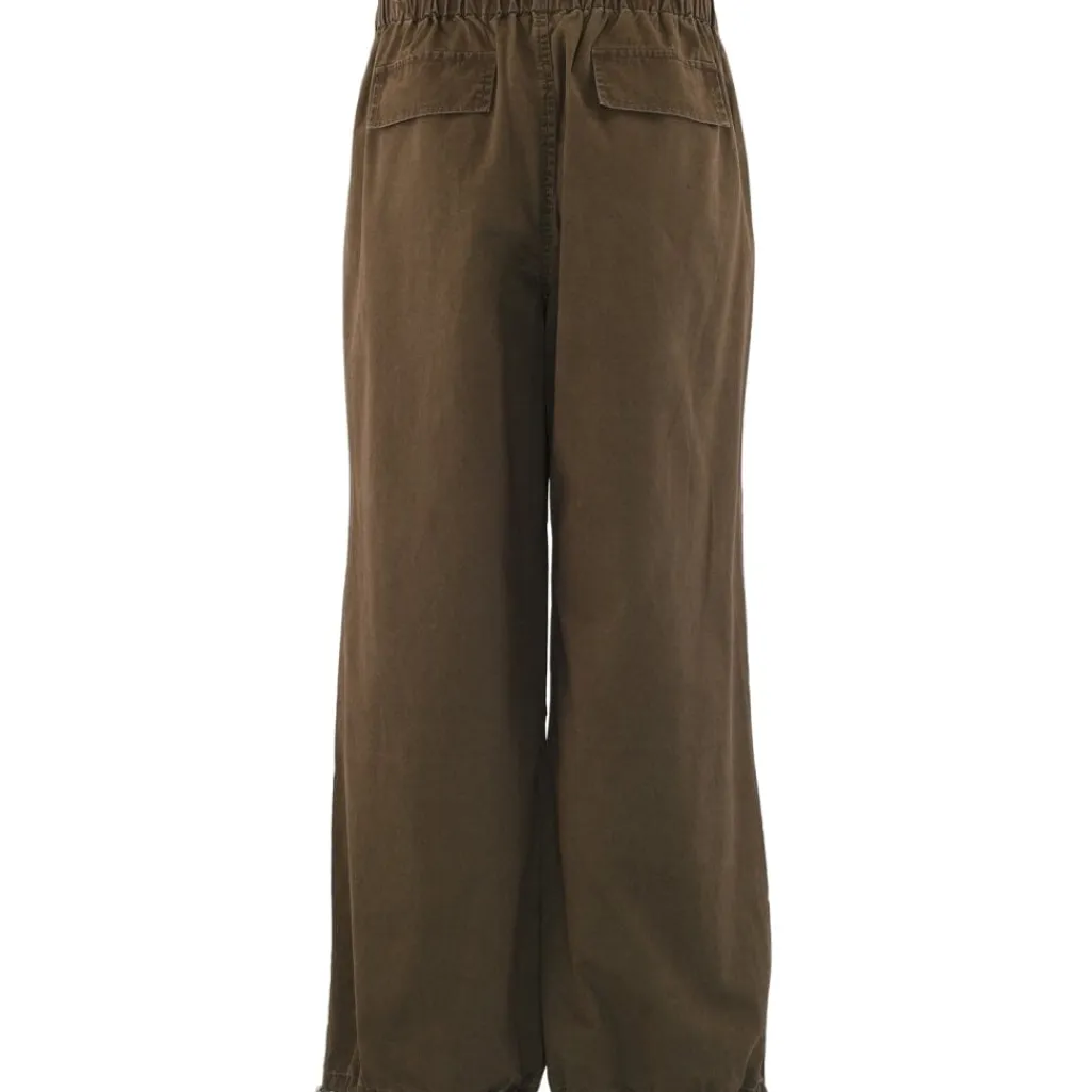Brune bukser fra Continue med løs pasform og lange ben. Bukserne har en snøre og elastik i taljen samt dekorative syninger.