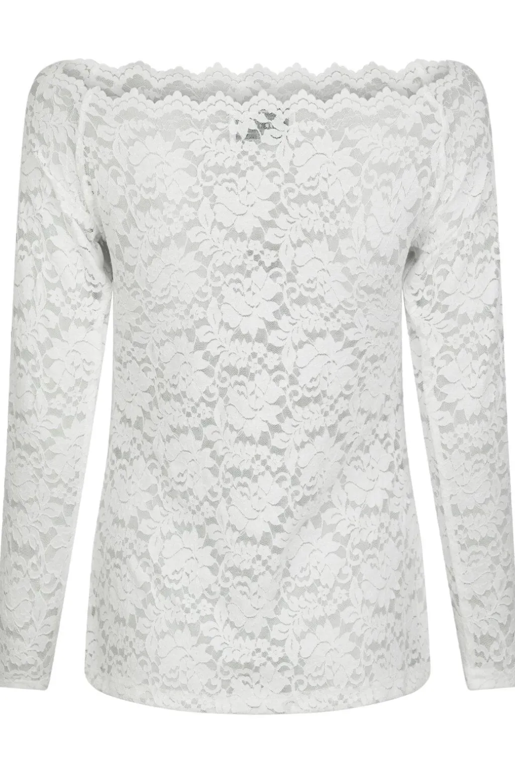 Hvid blondebluse fra Neo Noir med off-shoulder-design. Blusen har en bølget blondekant ved halsudskæringen og lange ærmer med blomstermønster i blonden.