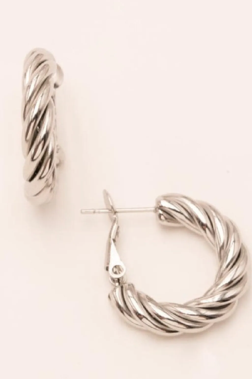 Snoede hoops-øreringe fra Mellow Moon i rustfrit stål med en forsølvet overflade. Øreringene har en tykkelse på 4 mm og et karakteristisk snoet design.