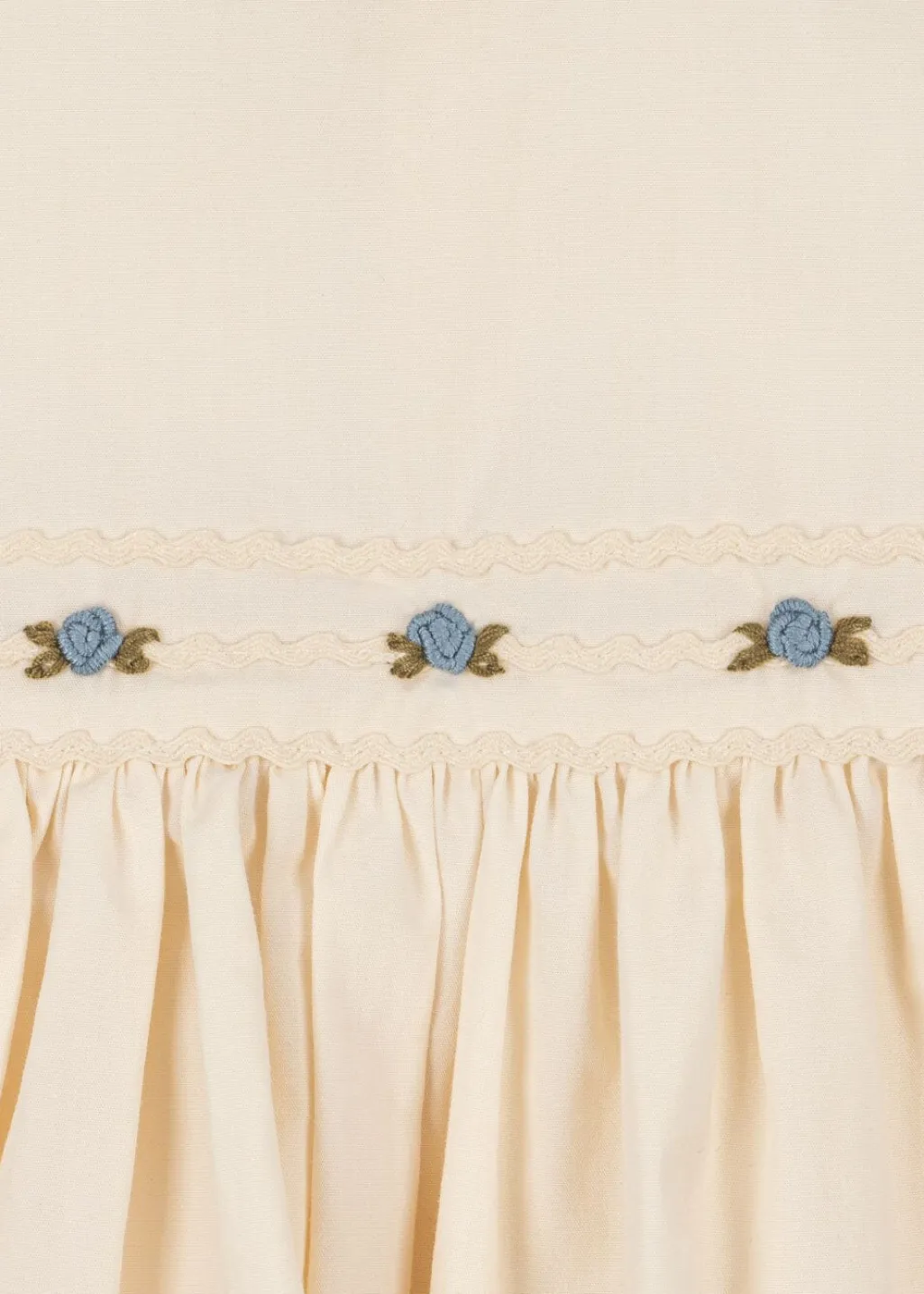 Flæserne ved skuldrene og de broderede detaljer gør sættet velegnet til særlige anledninger. Knapperne gør det nemt at tage tøjet af og på.