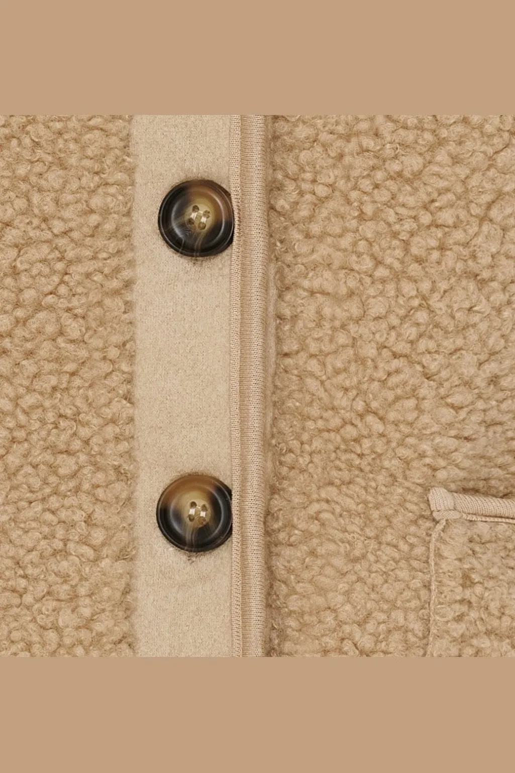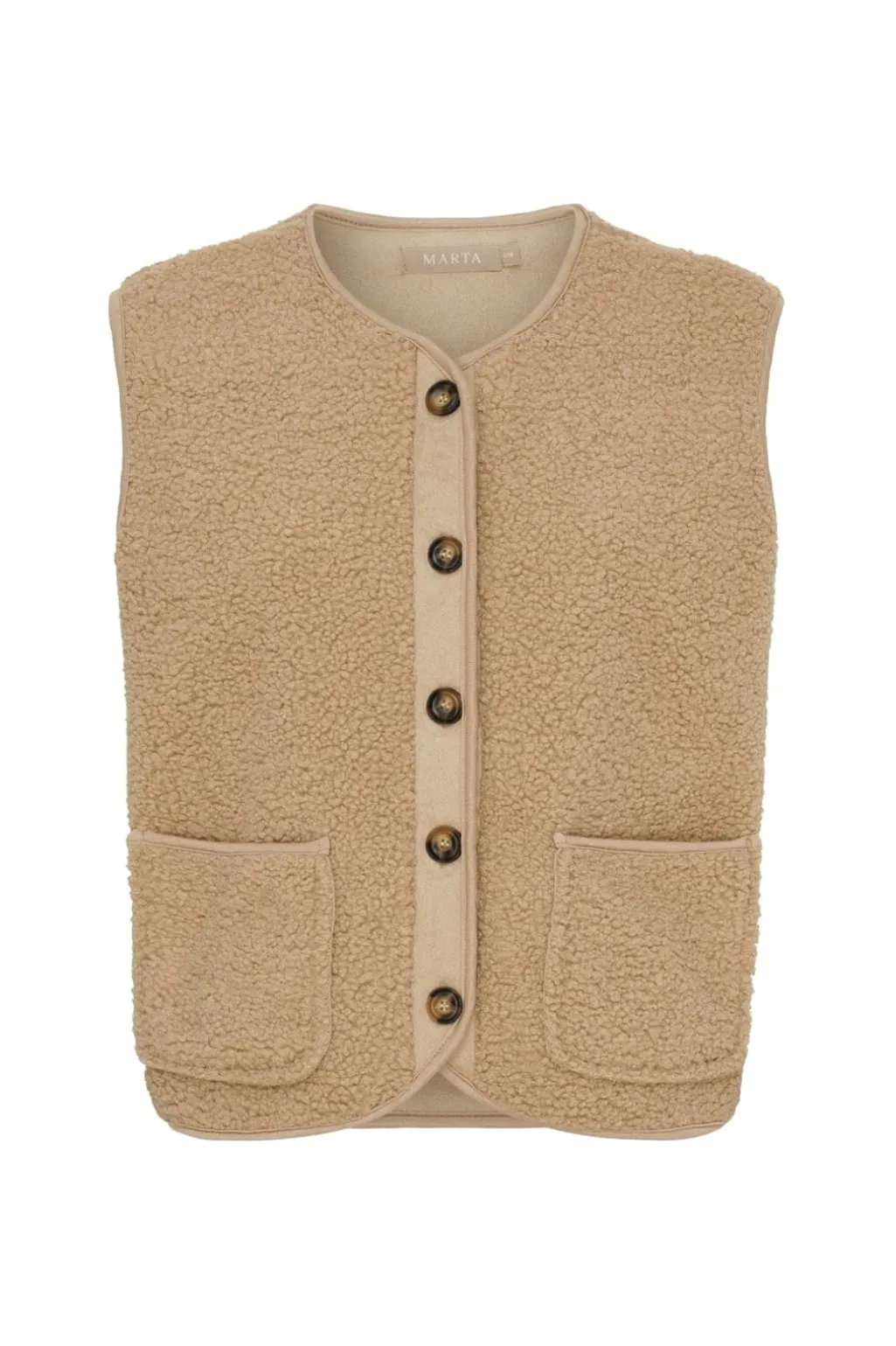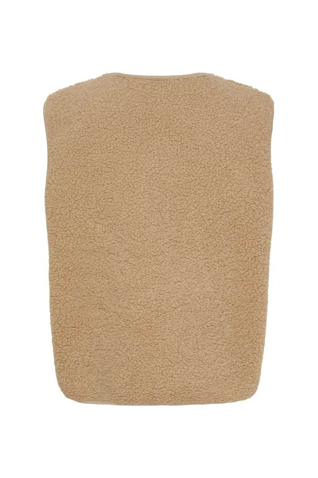 Vest fra Marta Du Chateau i camel-farve med blødt teddy-lignende materiale. Den har en praktisk knaplukning og to rummelige lommer foran.