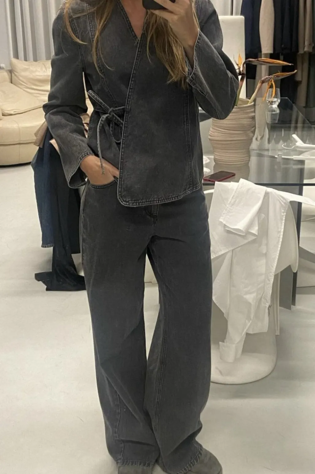 Grå omslagsjakke fra Global Funk med acid wash-effekt. Jakken har V-udskæring og bindebånd i taljen, der giver mulighed for at justere pasformen.
