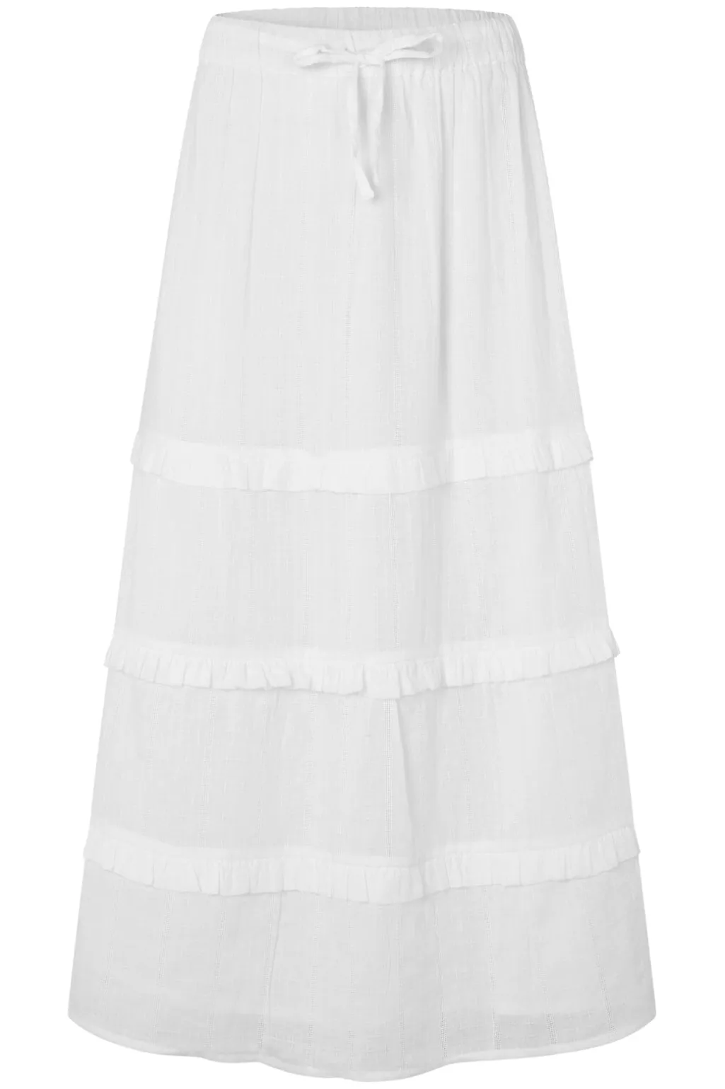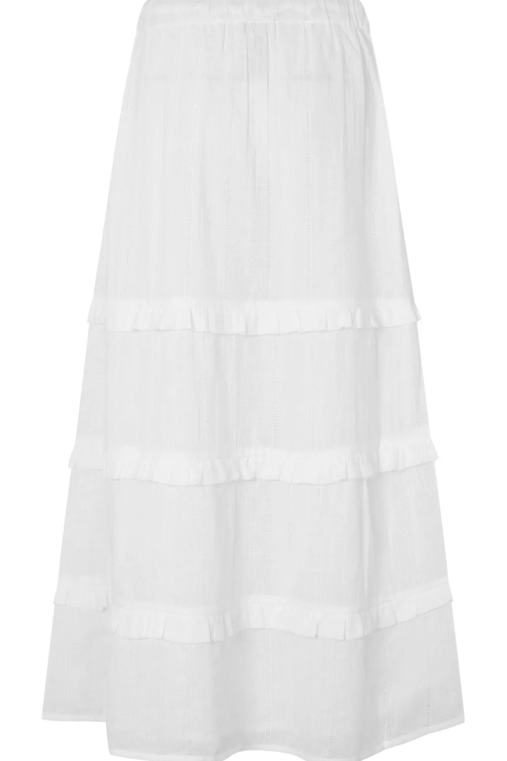 Hvid nederdel fra MbyM med tre vandrette flæser. Skørtet har en regulær talje med snøre og går til anklerne. De bløde lag giver bevægelse i stoffet.