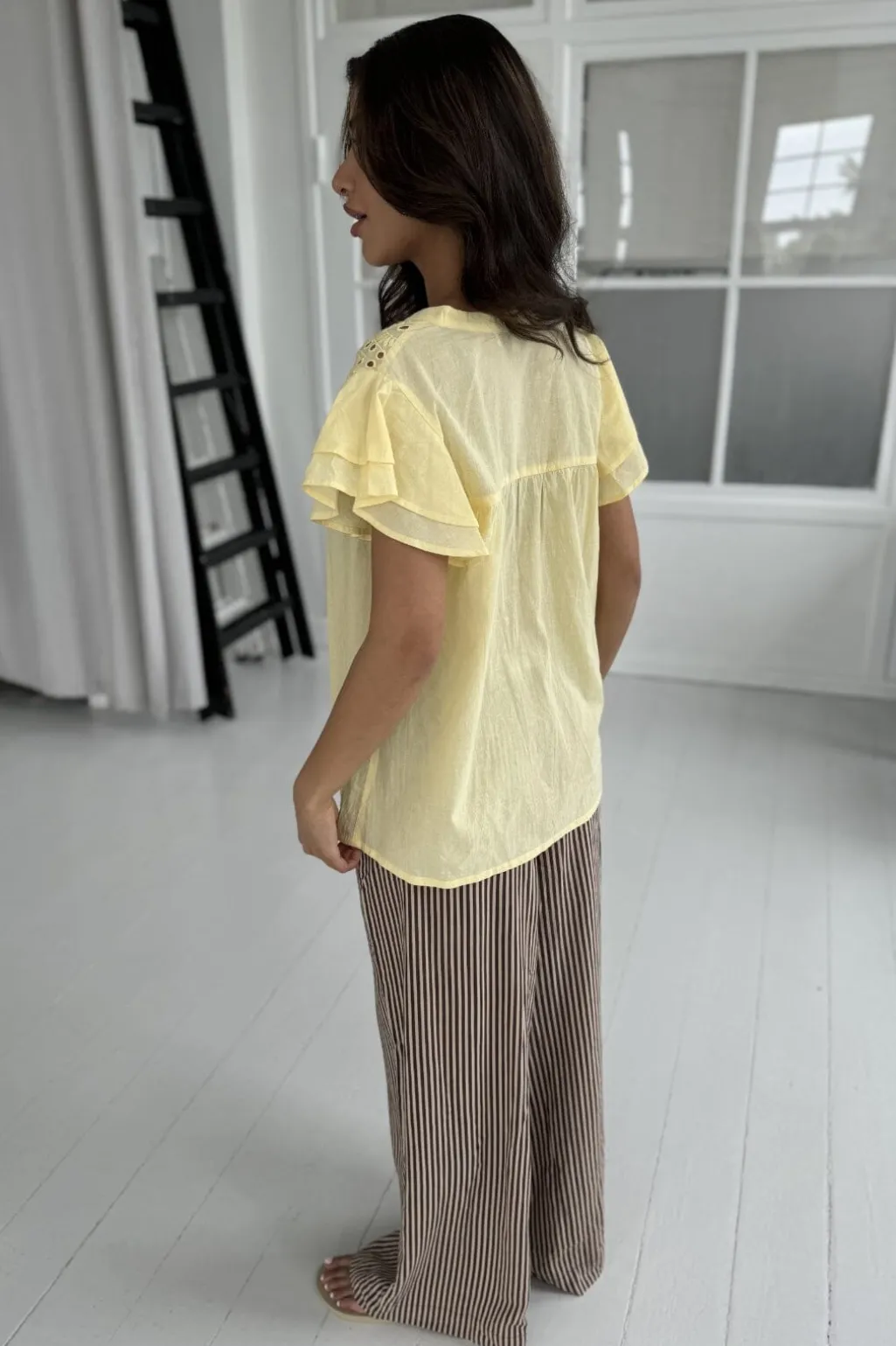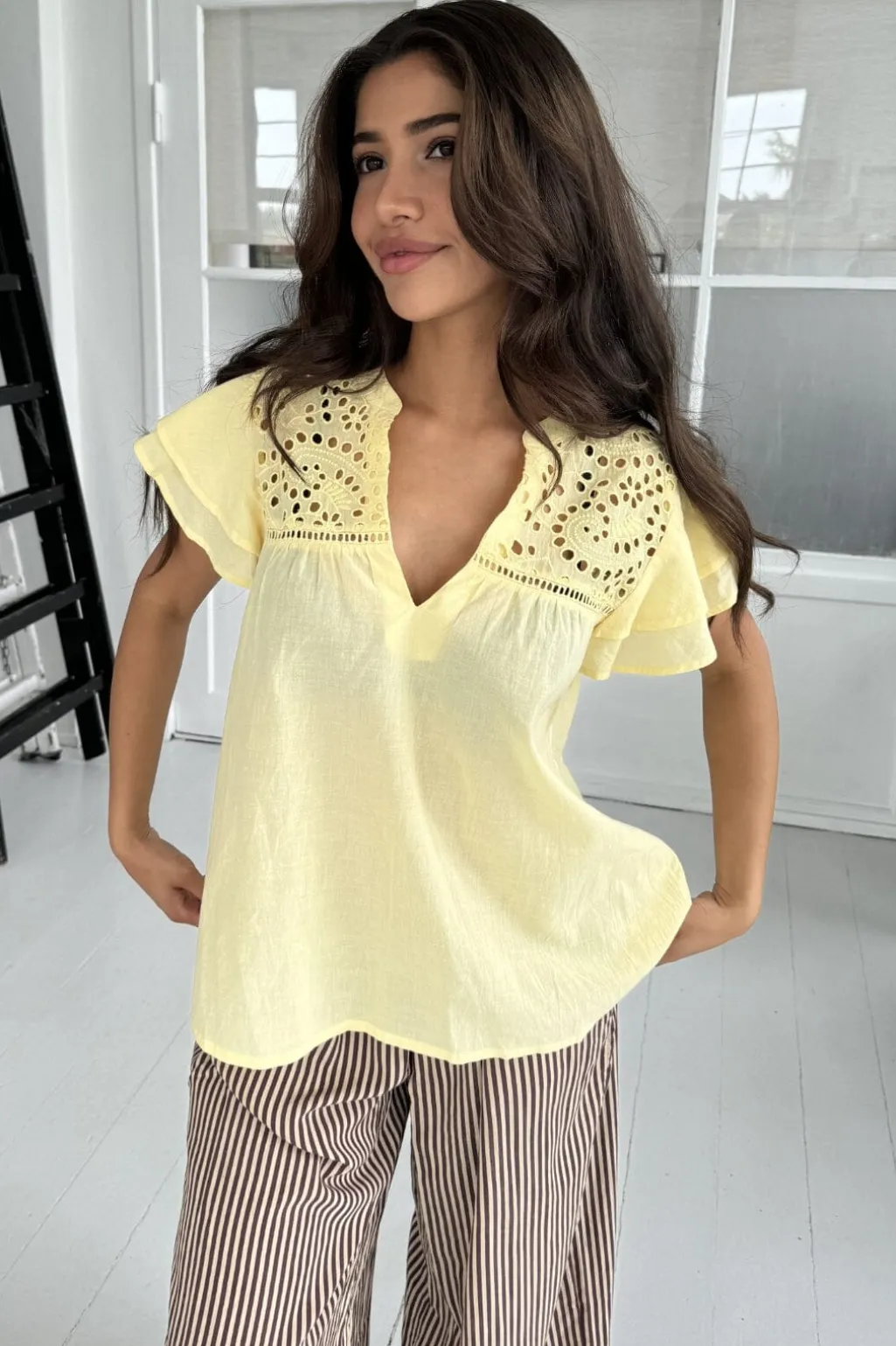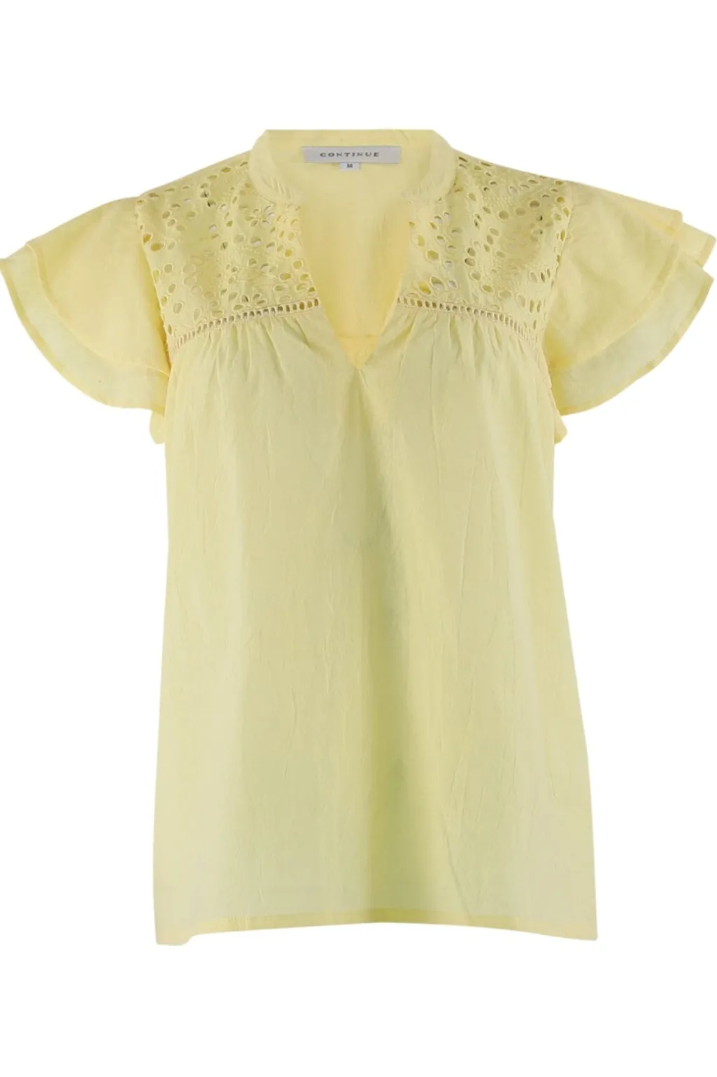 Lys gul bluse fra Continue med broderede detaljer ved halsudskæringen. Blusen har rynkede ærmer og en V-udskæring med hulmønster, der giver et sommerligt udtryk.