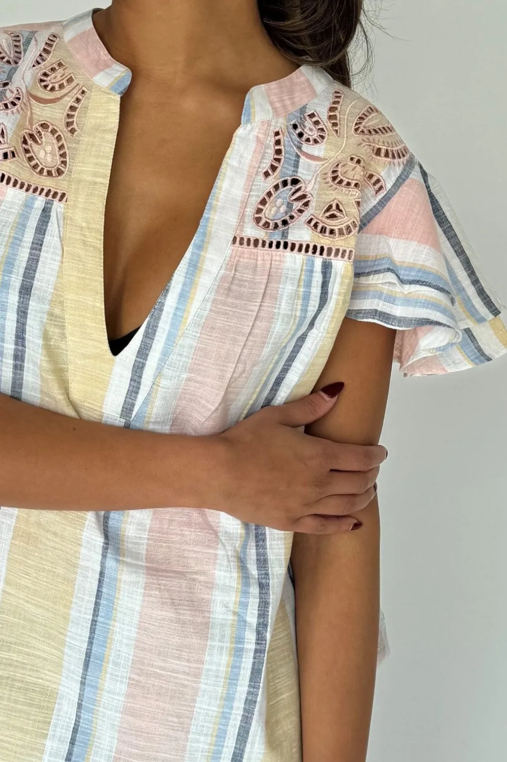 Stribet top fra Continue med lyserøde, blå og gule striber. Toppen har blondekant ved V-udskæringen og korte ærmer med flæser. Stoffet er let og luftigt.