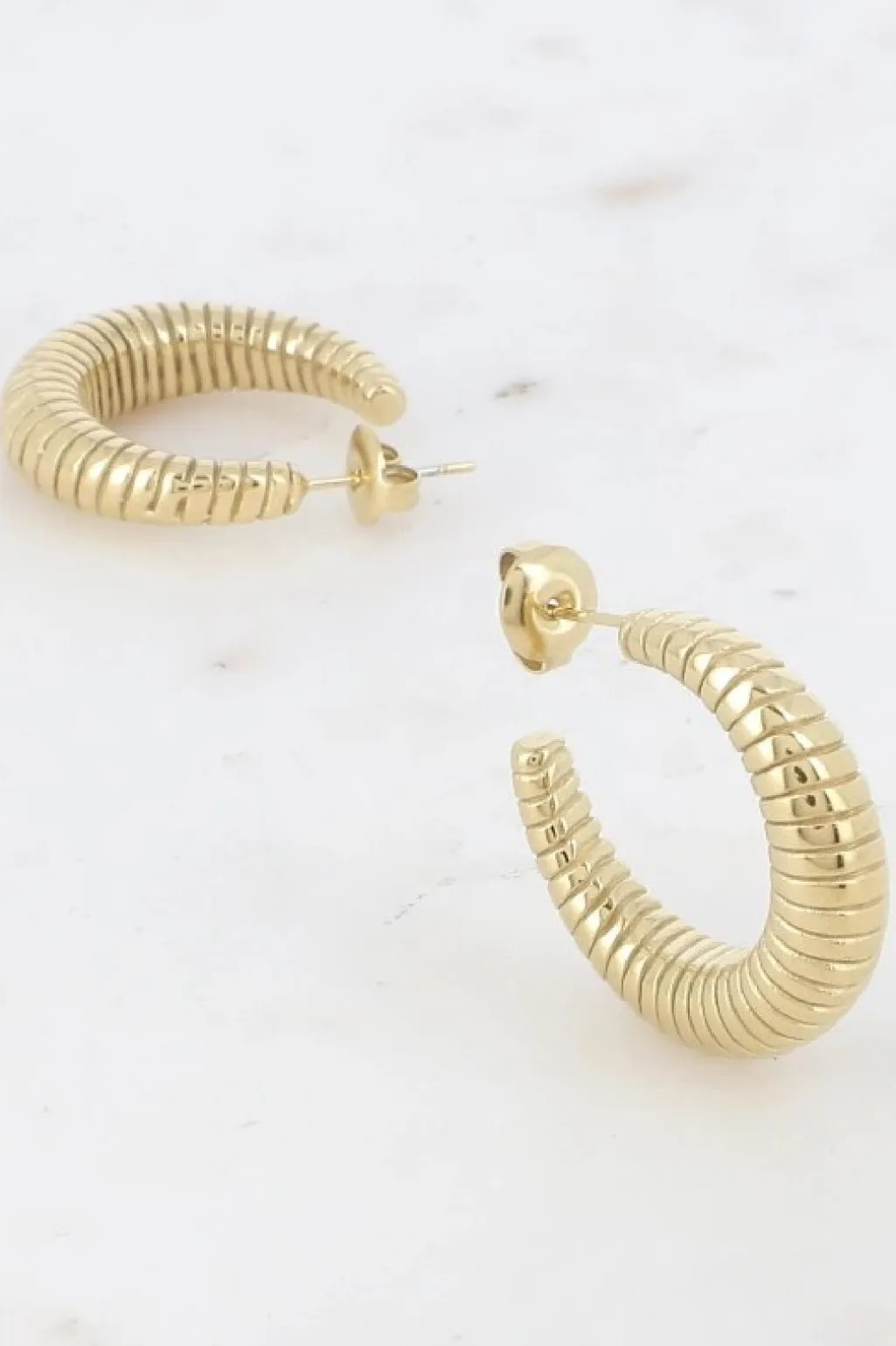 Runde hoops fra Mellow Moon med en bølget, ribbet overflade. Øreringene er lavet i rustfrit stål med en gylden finish, der skaber et fint spil i lyset.