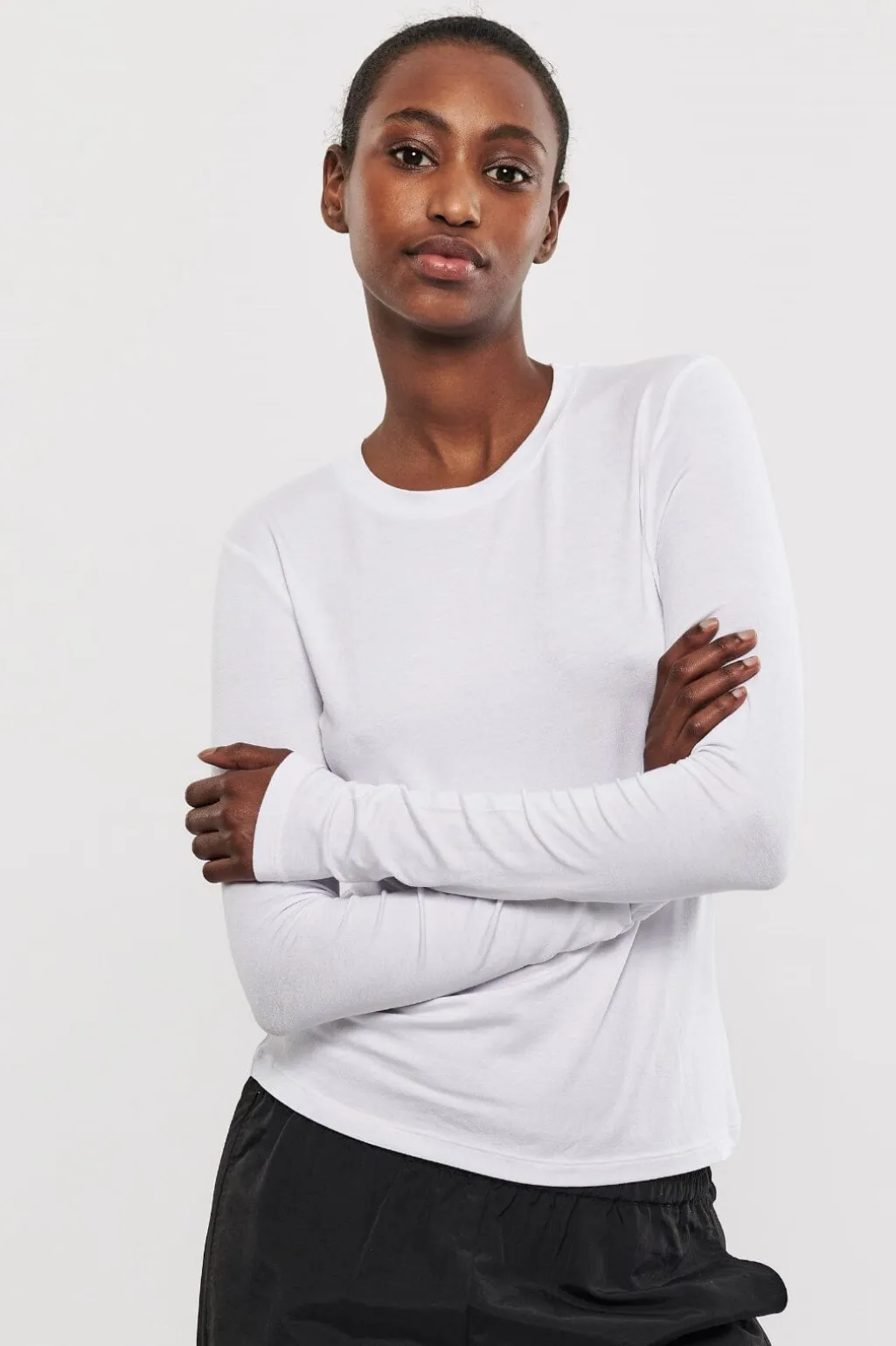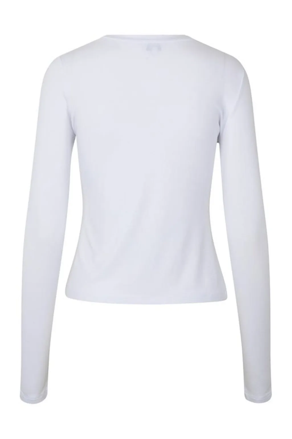Hvid bluse fra MbyM i blødt TENCEL™ Modal med lange ærmer og rund hals. Den tætsiddende pasform og det strækbare materiale gør den velegnet til både sport og hverdag.