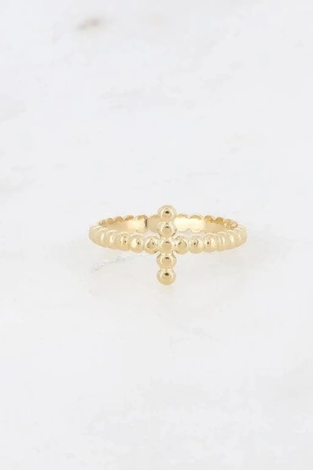 Guldfarvet ring fra Mellow Moon med et korsdesign af små kugleformede elementer. Ringen er lavet af rustfrit stål med en forgyldt overflade, der giver et skinnende udtryk.