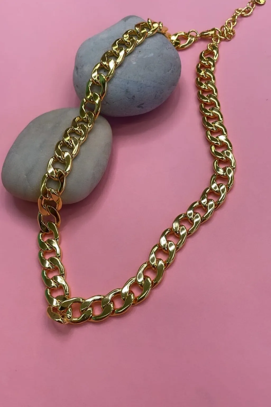 Guldbelagt halskæde fra Mellow Moon med store kædeled. Den skinnende overflade og de kraftige led giver halskæden et markant udtryk, der kan styles til mange anledninger.