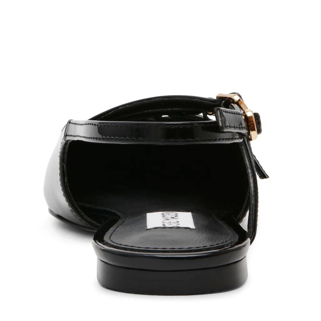Sort sandal fra Steve Madden med lakfinish. Skoen har en spids tå og tre tynde remme med gyldne spænder, der krydser hen over foden.