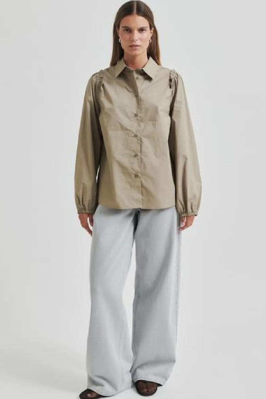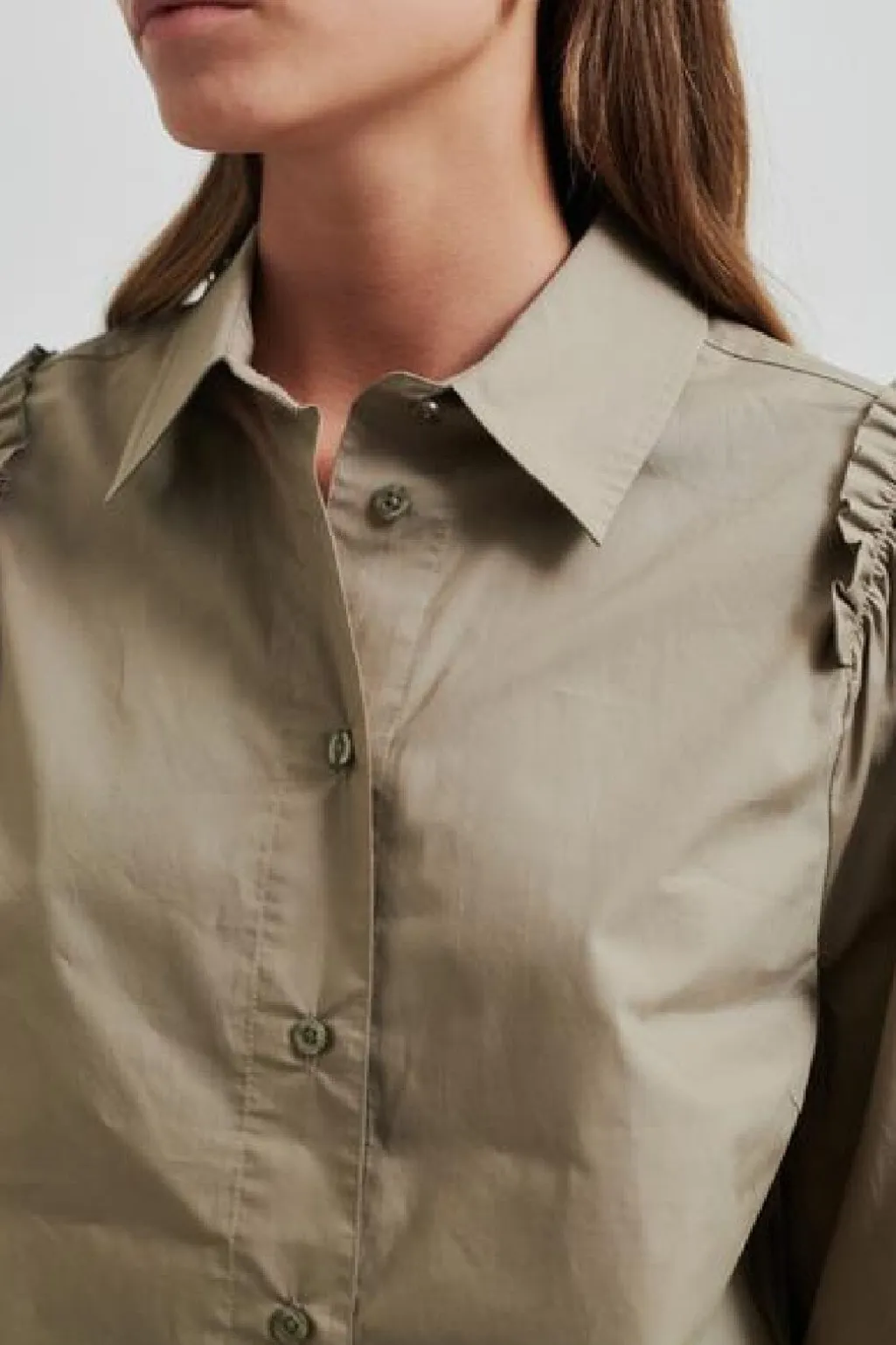 Skjorte fra Second Female i farven Fallen Rock. Den er fremstillet i økologisk bomuld med pufærmer og rynkdetaljer ved skuldrene. Skjorten har klassisk krave og knaplukning foran.