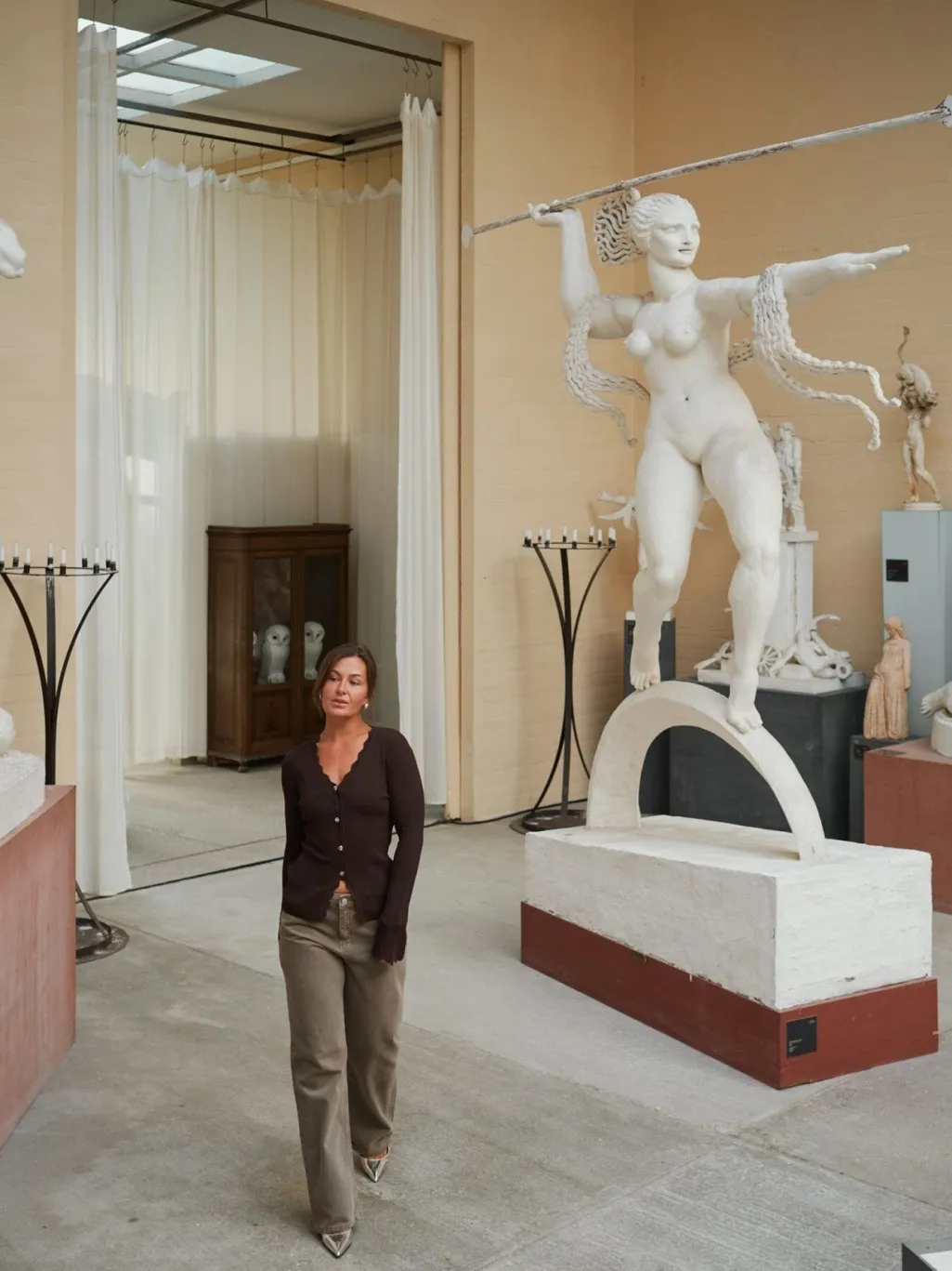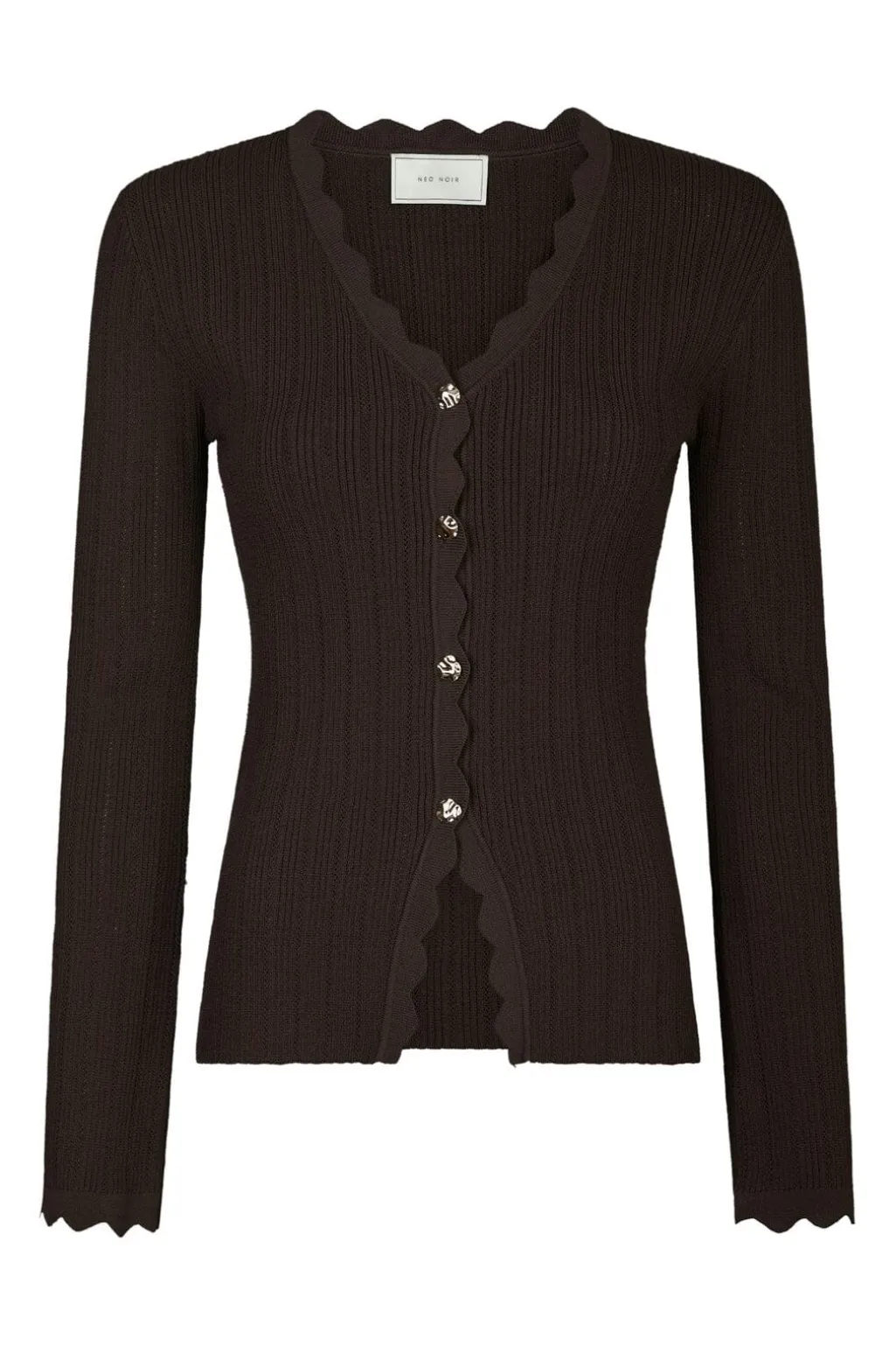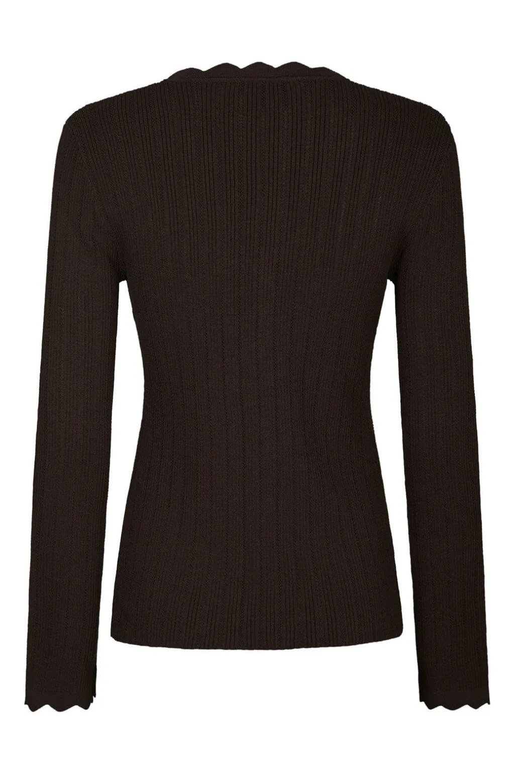 Mørkebrun strikket bluse fra Neo Noir med ribbet tekstur. Blusen har en V-halsudskæring med bølget kant og en tætsiddende pasform, der følger kroppens linjer.