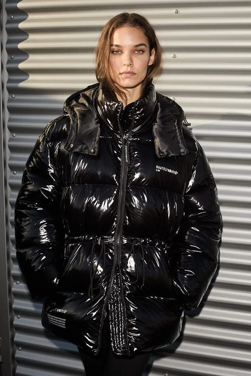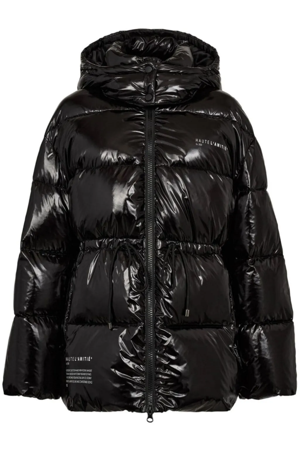 Sort pufferjakke fra Haute L’Amitié, lavet af 100 % nylon med en skinnende overflade. Jakken har en lynlås foran og synlige snoretræk i taljen.