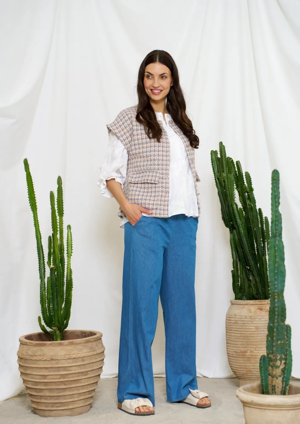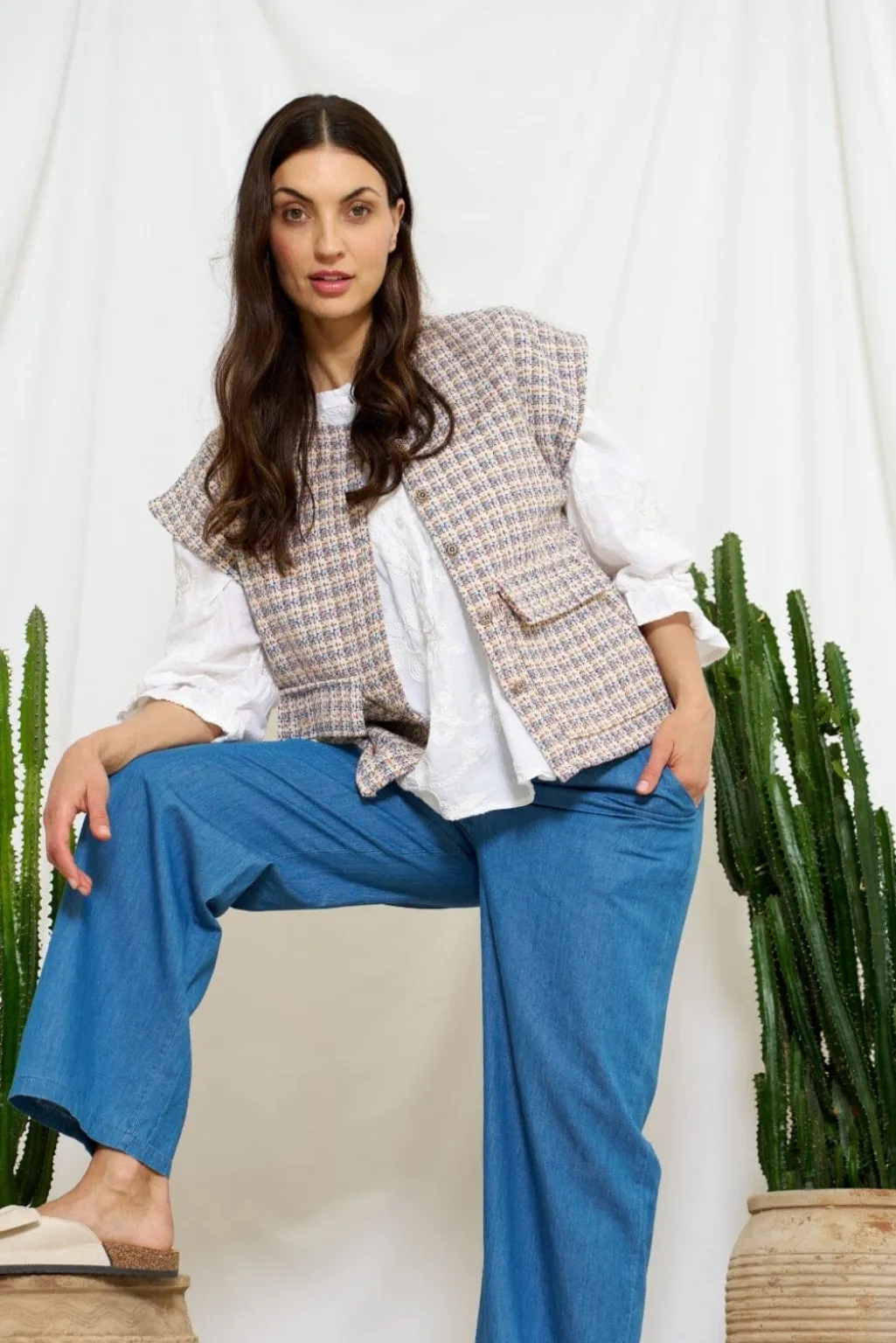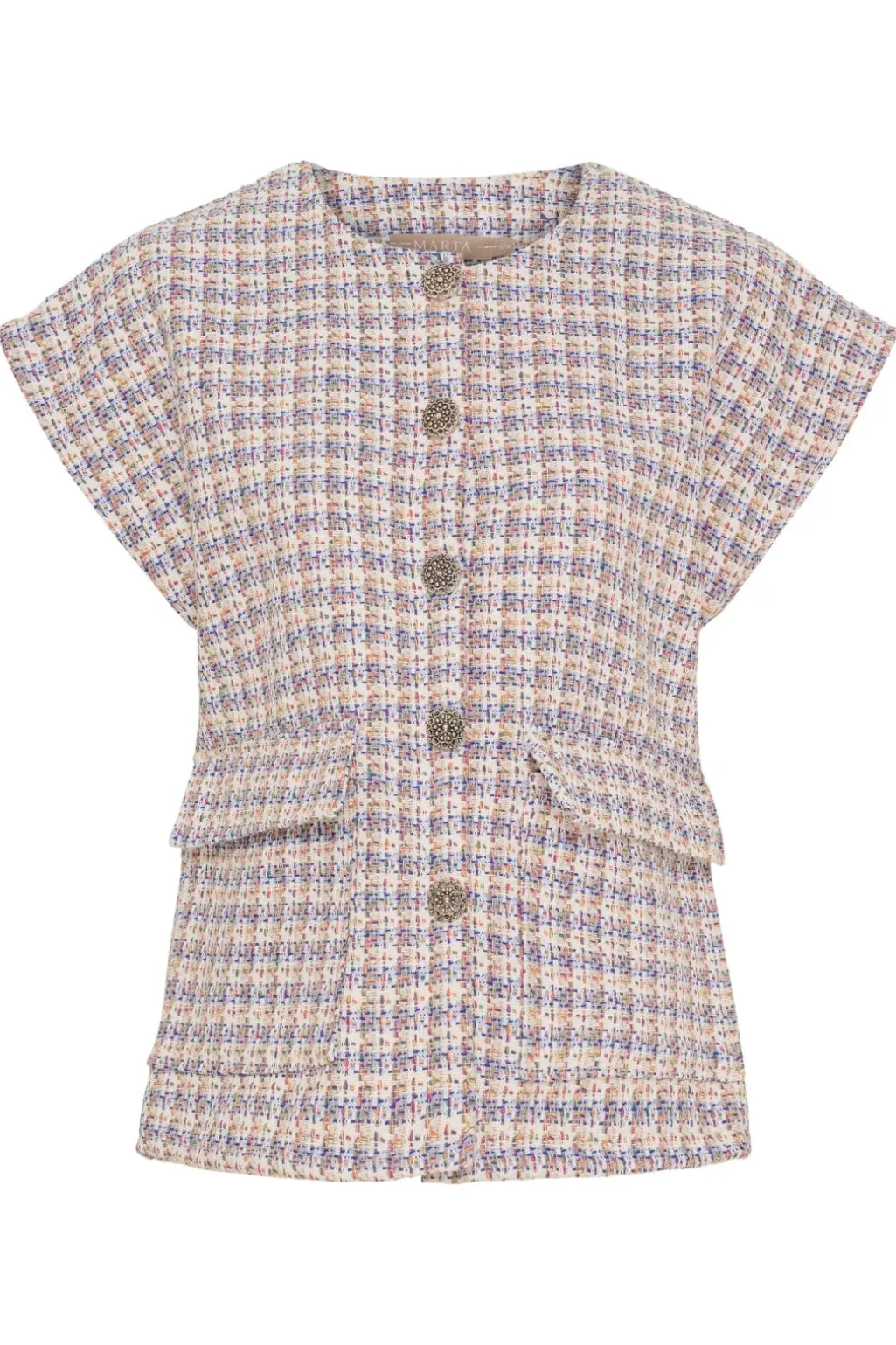 Blå vest fra Marta Du Chateau med ternet mønster i blå, cream og hvide nuancer. Den har flæsedetaljer og knapper foran, der giver vesten et særligt præg.