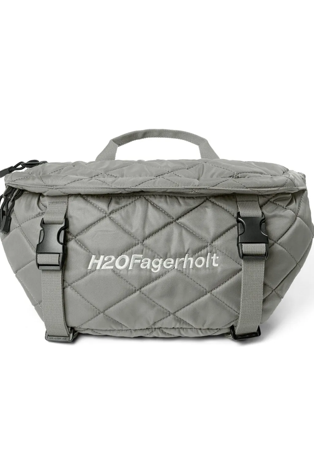 Grå quiltet taske fra H2O Fagerholt med harlekinmønster og polyesterfyld. Tasken har både top-håndtag og justerbar skulderrem med spænde.