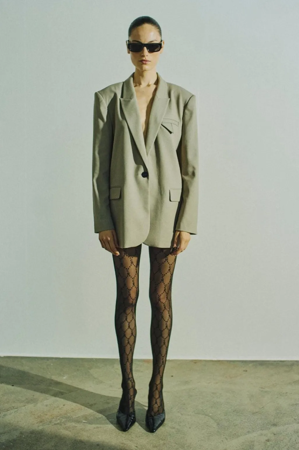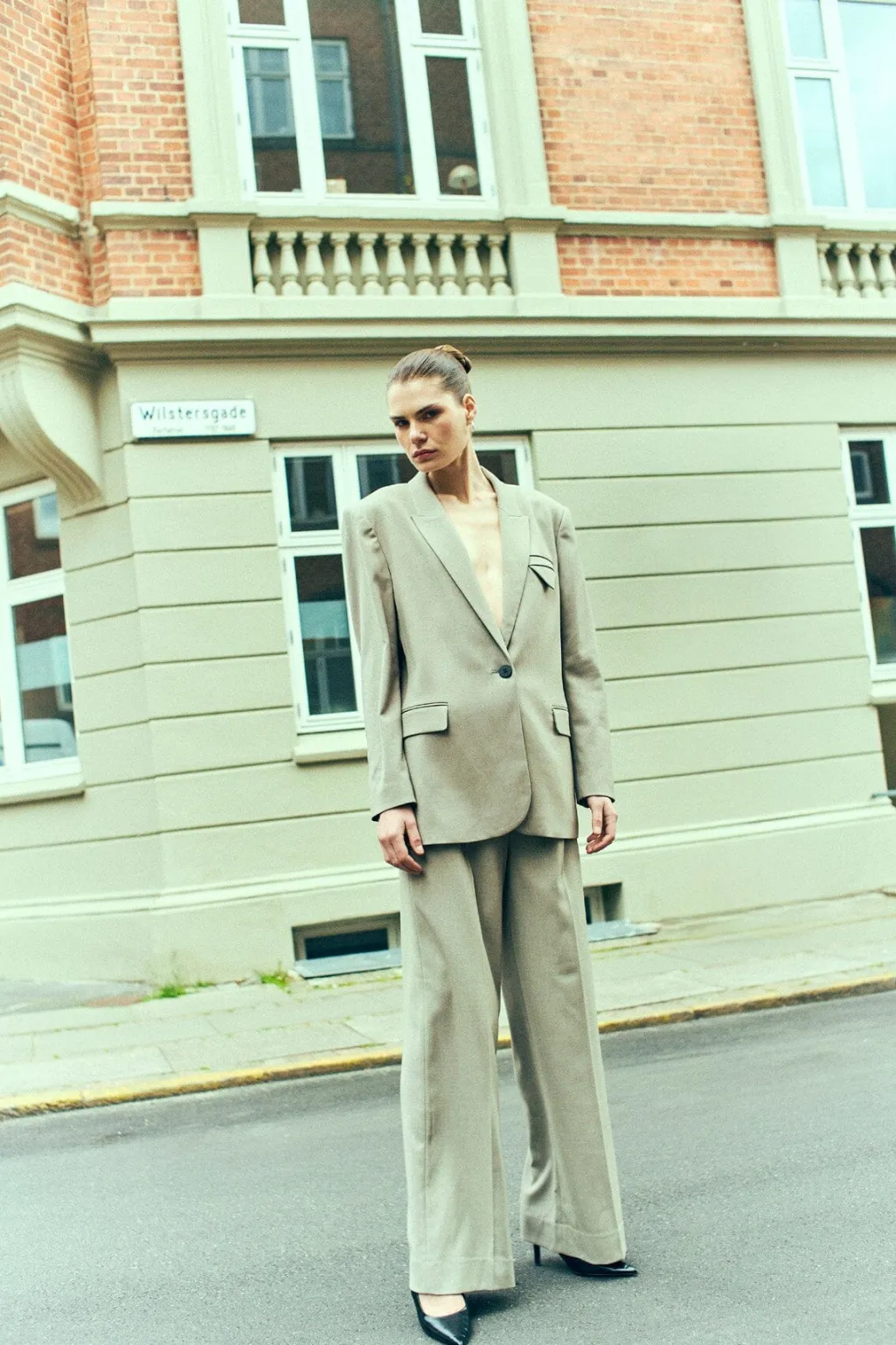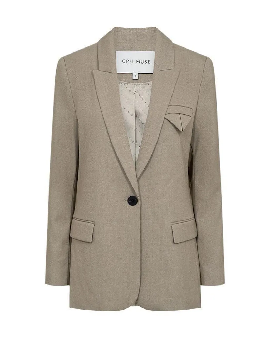 Skræddersyet blazer fra Copenhagen Muse i en beige-grøn meleret farve. Jakken har brede skuldre, V-udskæring med revers og en logomønstret foering. Den passer til både formelle, afslappede og festlige lejligheder.