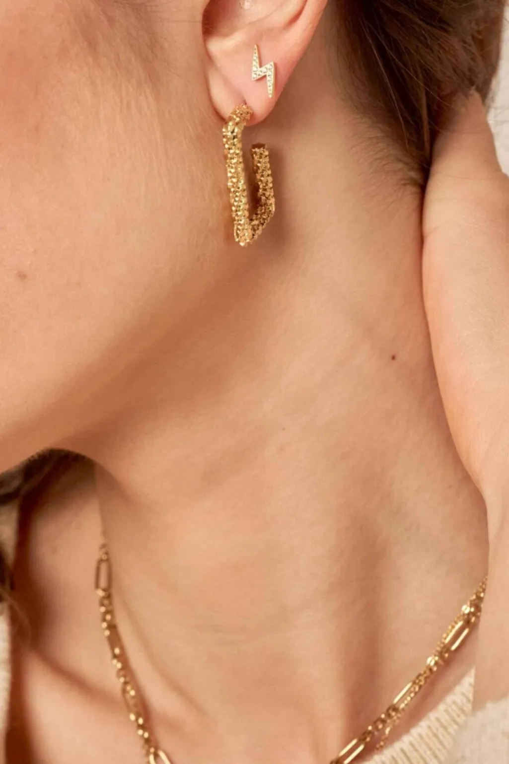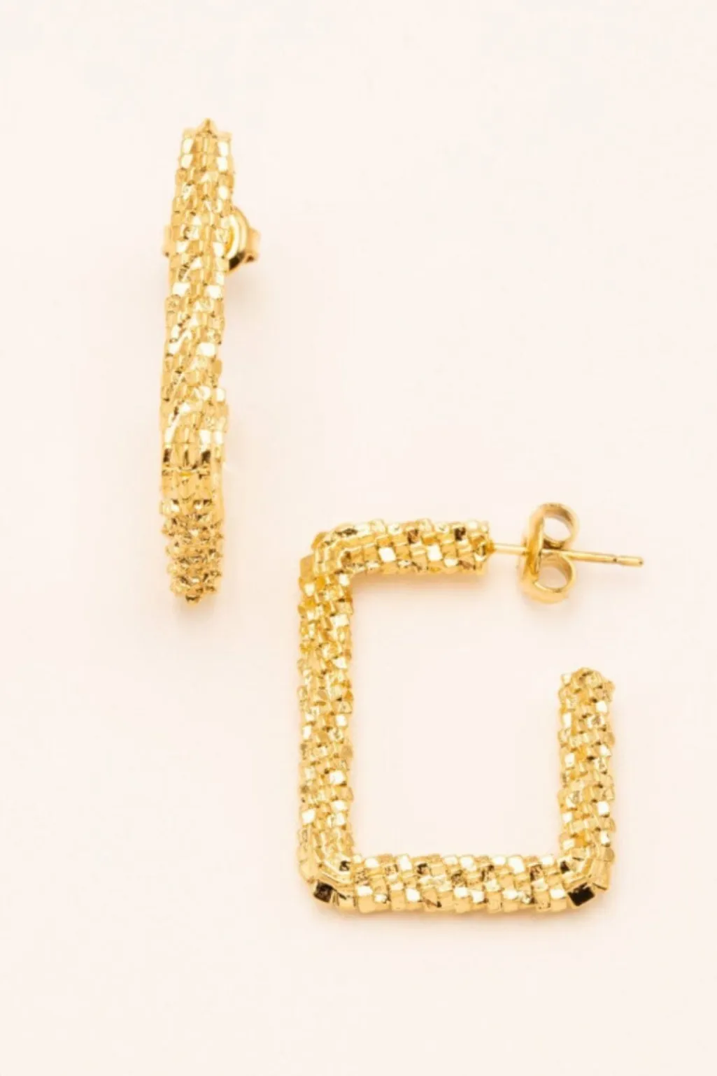 Firkantede hoops fra Mellow Moon i rustfrit stål med forgyldt finish. Øreringene har en struktureret overflade og en geometrisk form, der giver dem et distinkt udtryk.