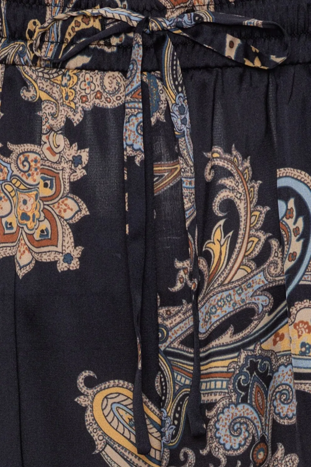 Bukser fra Karmamia i satin terylen med paisley-mønster i mørkeblå og lyseblå nuancer. Bukserne har en løs pasform og elastik med snøre i taljen.