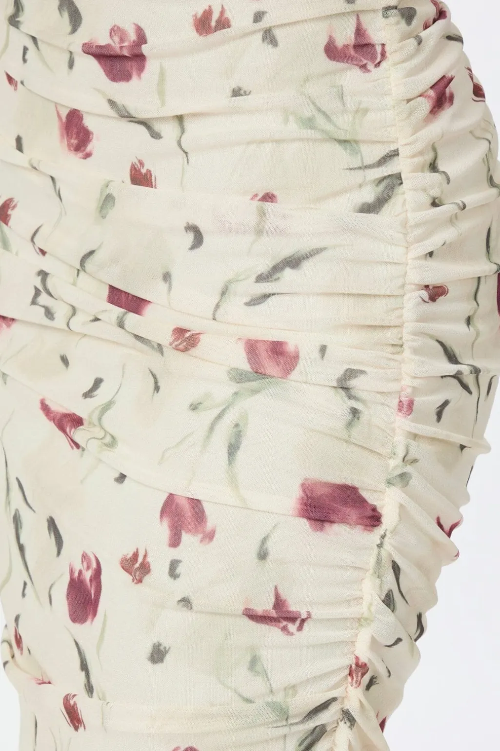 Cremefarvet meshkjole fra Neo Noir med pink blomsterprint. Kjolen har rynkdetaljer langs sidesømmen og er syet i et let og luftigt materiale med rund hals.