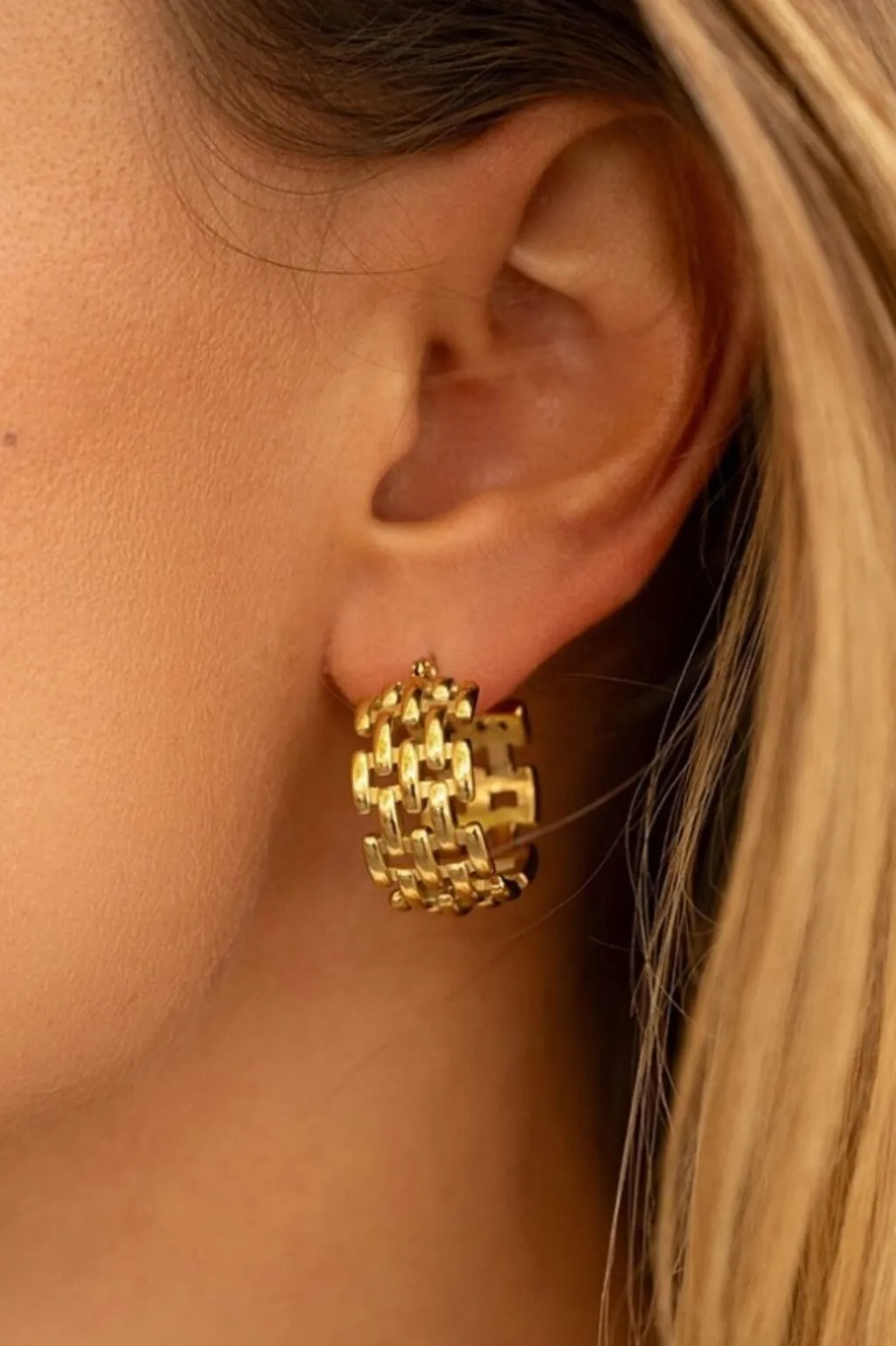 Forgyldte hoop-øreringe fra Mellow Moon med et flettet design. Øreringene har en bred form med et gennemgående mønster af sammensatte led, der skaber et dekorativt udtryk.