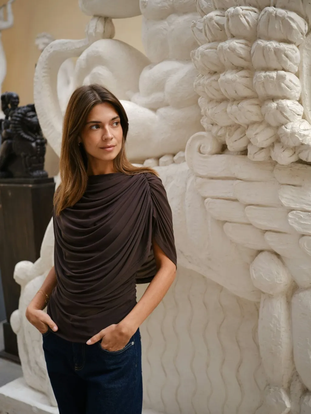 Brun mesh-top fra Neo Noir med draperet design. Toppen har et gennemsigtigt stof med rynkedetaljer langs sidesømmen og drapering foran.