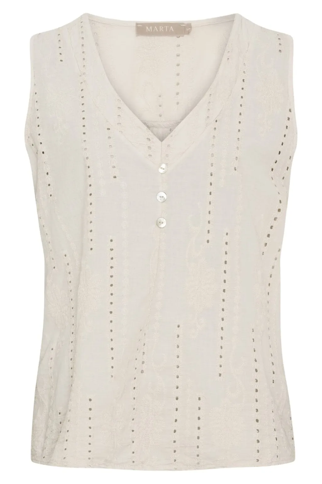 Beige top fra Marta Du Chateau med broderi og knaplukning foran. Toppen har et blomstret mønster i broderiet og en v-halsudskæring, der giver den et håndlavet præg.