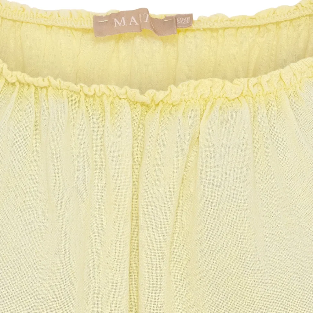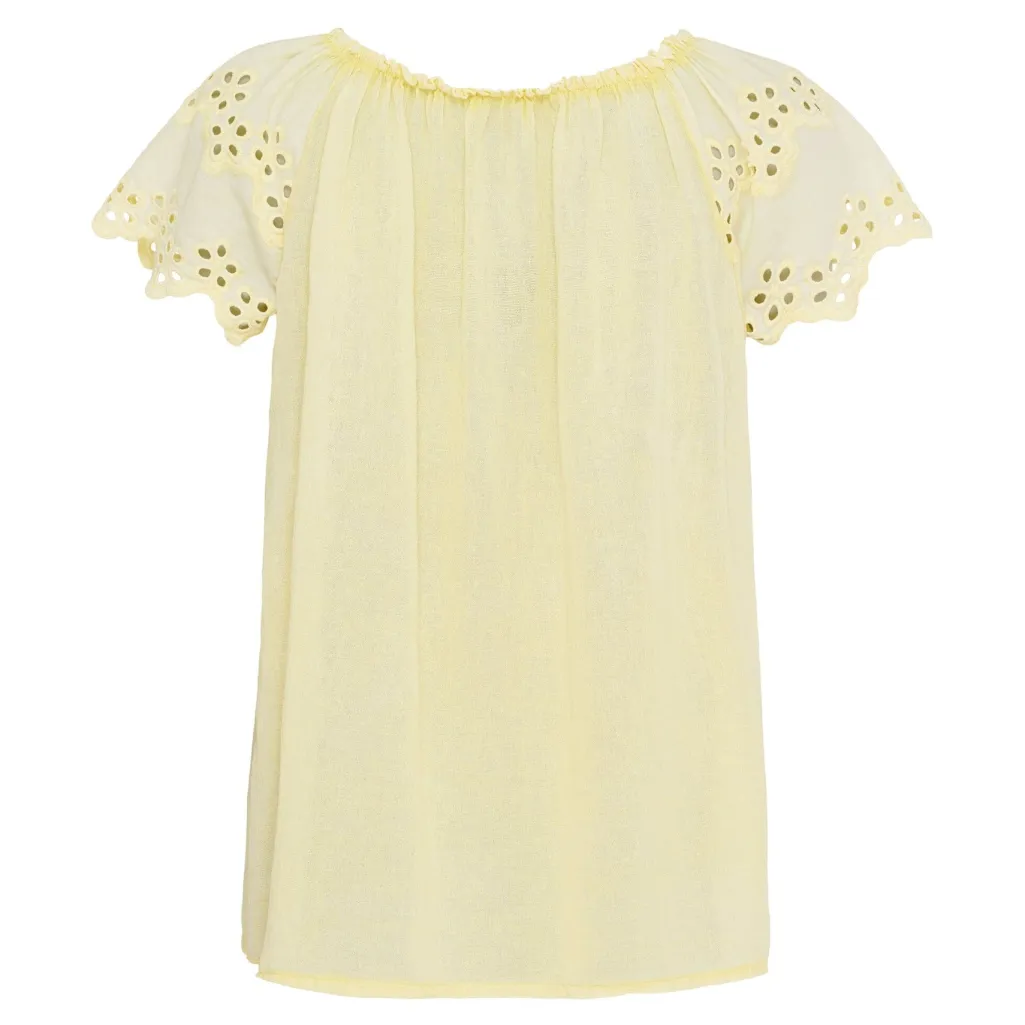 Gul bomuldsbluse fra Marta Du Chateau med off-shoulder design og broderede ærmer. Blusen har en løs pasform og korte ærmer med blomsterbroderi.