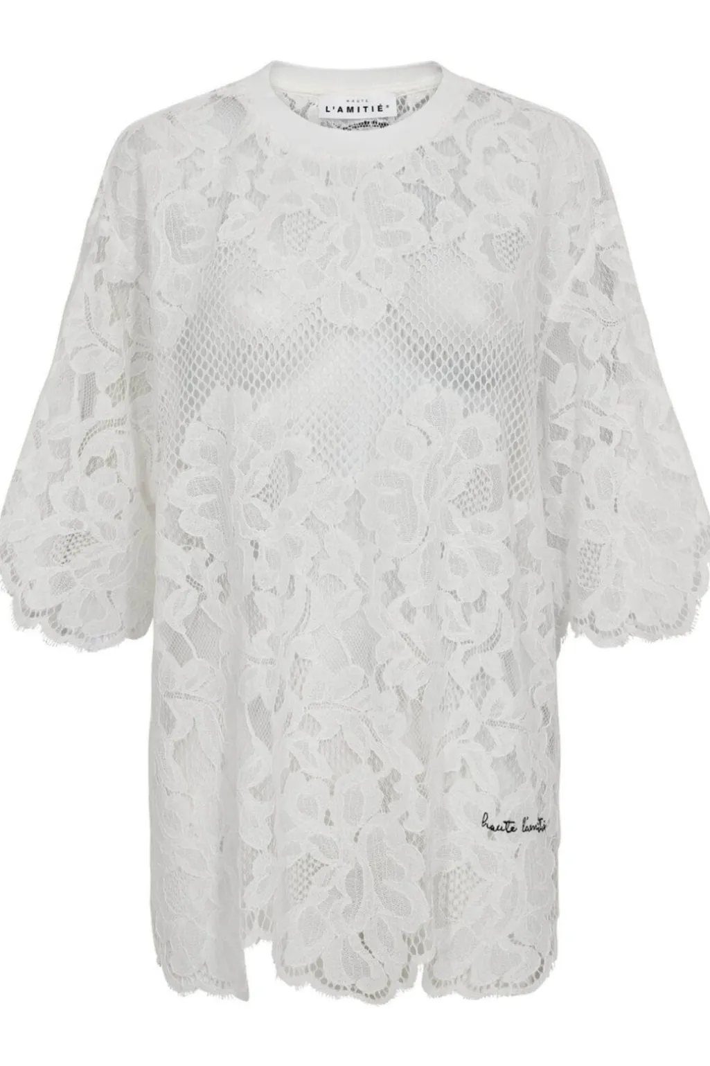 Off-white t-shirt fra Haute L’Amitié med blomstret blondemønster over hele stoffet. T-shirten har korte ærmer og en rund halsudskæring med ribkanter.