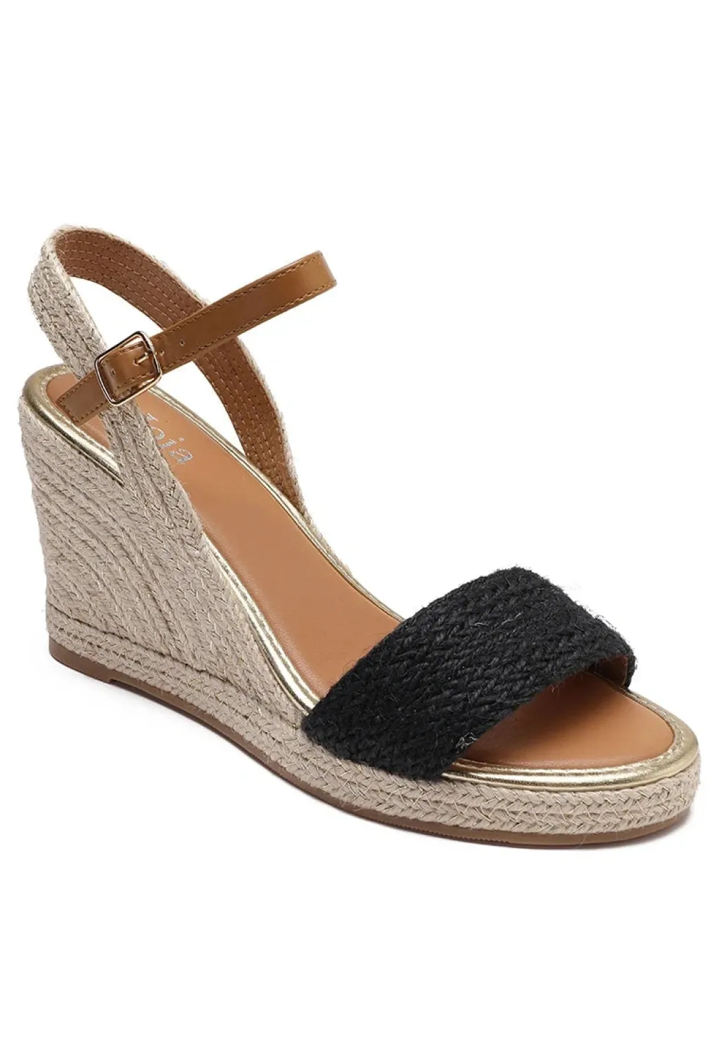 Sort sandal med kilehæl fra Bloom. Den har en åben tå og spænde-lukning ved anklen. Sandalen er fremstillet af syntetisk materiale med en brun ankelrem.