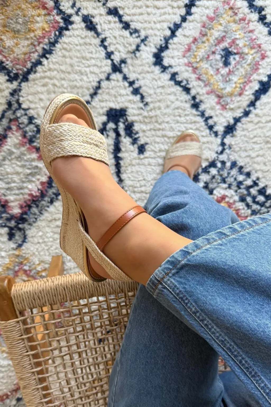 Beige wedgesandaler fra Bloom med vævet overdel og brun ankelrem. Sandalerne har en wedgehæl på 5-8 cm og er fremstillet i syntetisk materiale med spænde-lukning ved anklen.