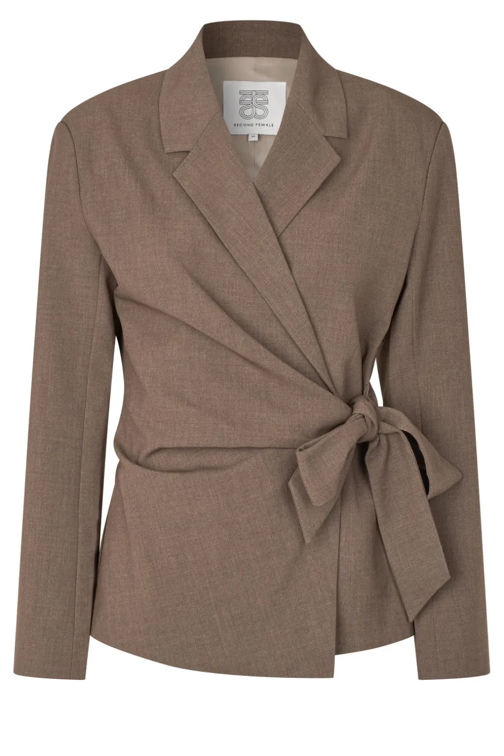 Wrap blazer fra Second Female i brun melange. Blazeren passer til både formelle anledninger, hverdagen og festlige lejligheder.