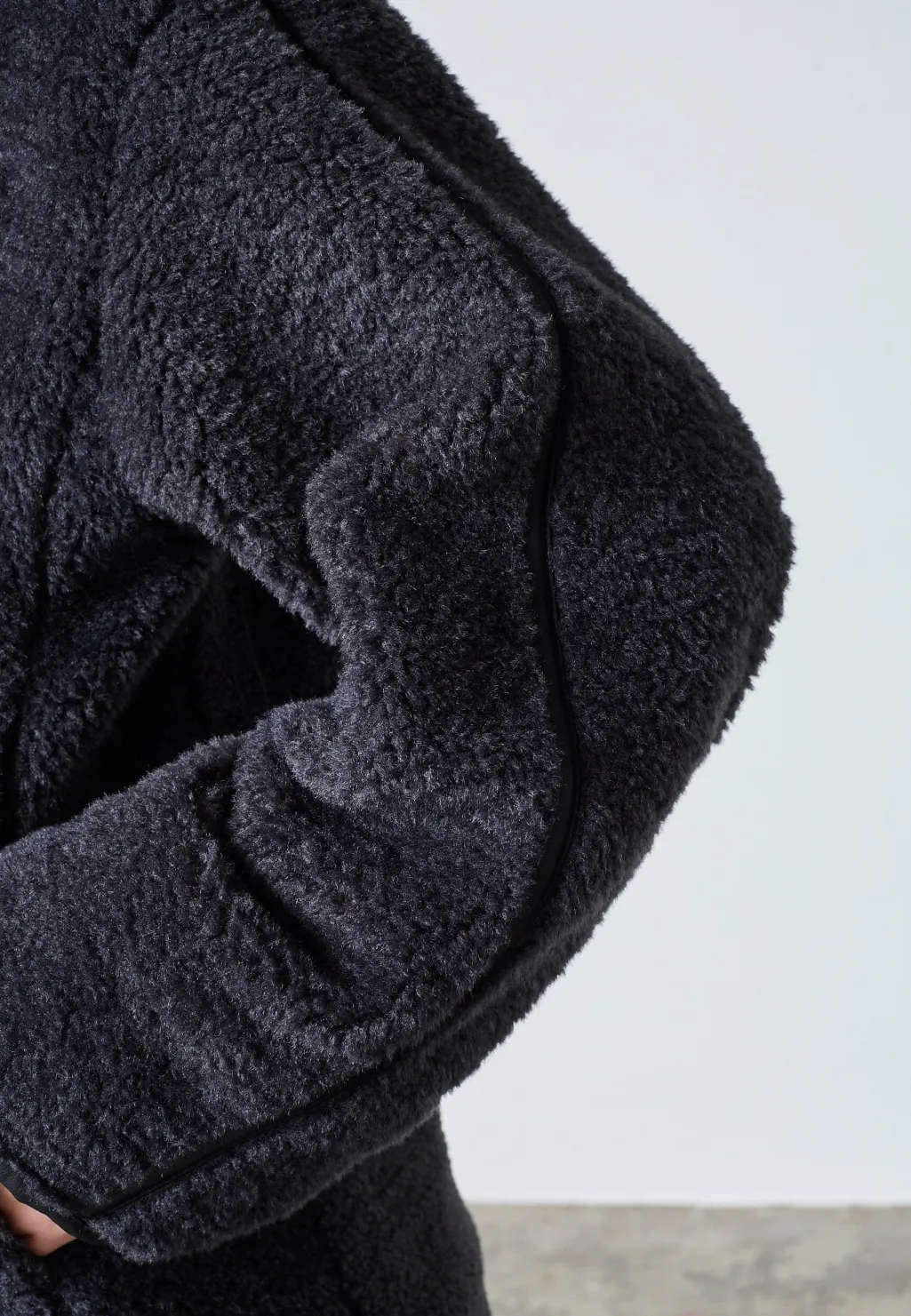 Jakke fra Sisters Point, lavet af blød imiteret plys i en mørk antracitnuance. Jakken har en høj hals og en oversized pasform.