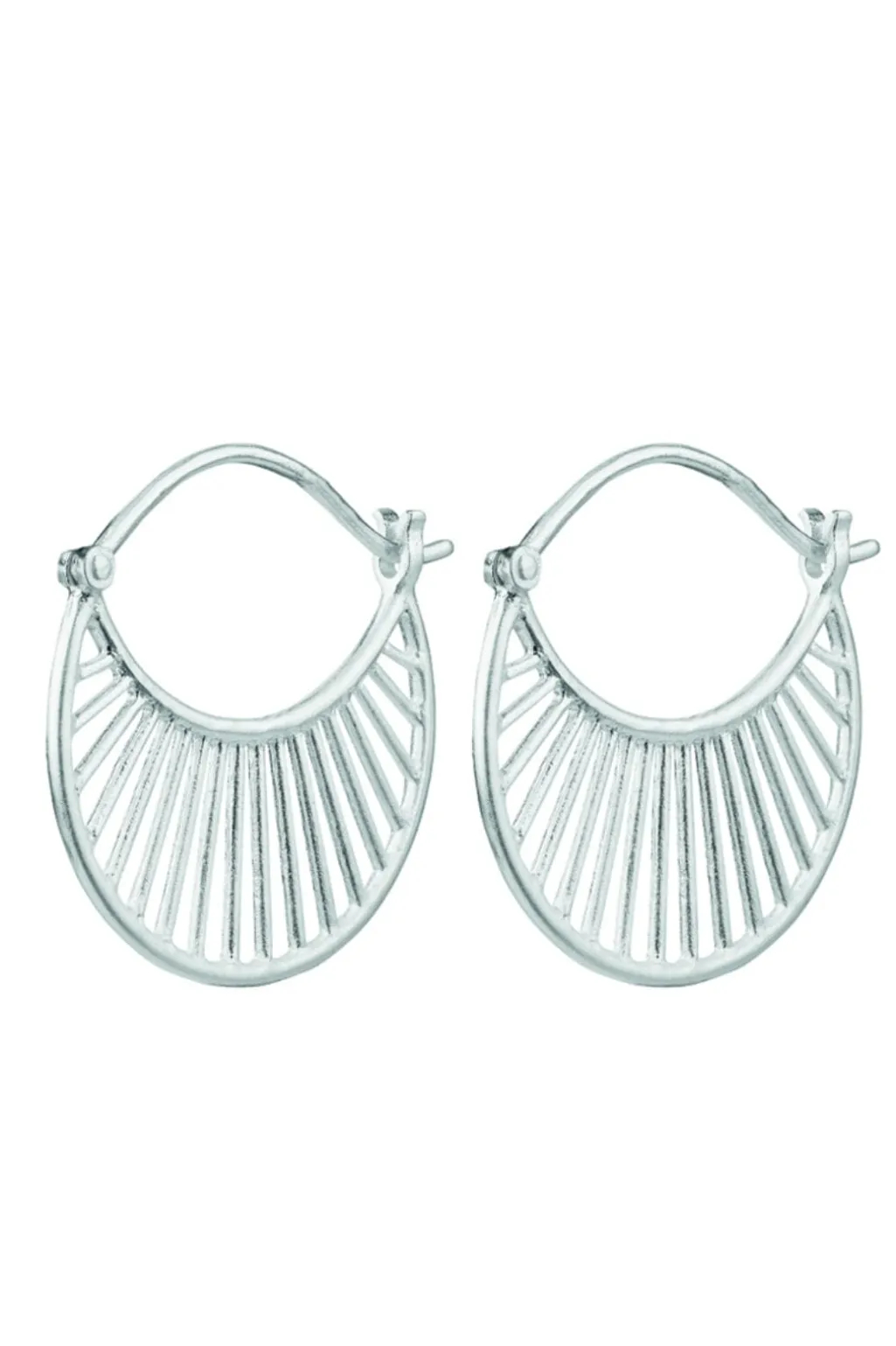 Sølvøreringe fra Pernille Corydon Jewellery med et solstråledesign. Øreringene har en buet form med lodrette linjer og er fremstillet i sterling sølv.