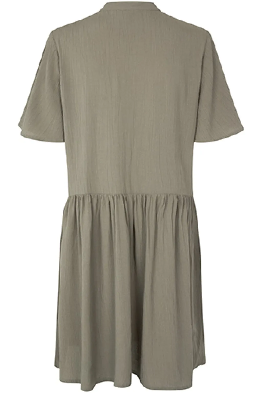 Kjole fra MbyM i en dæmpet grøn nuance. Den har skjortekrave, knapper foran og korte ærmer. Nederdelen falder løst fra taljen med et let og luftigt udtryk.