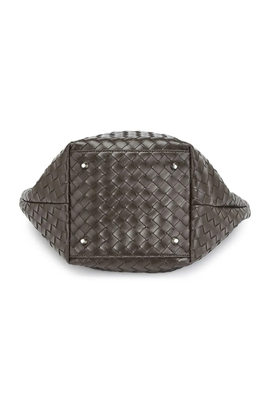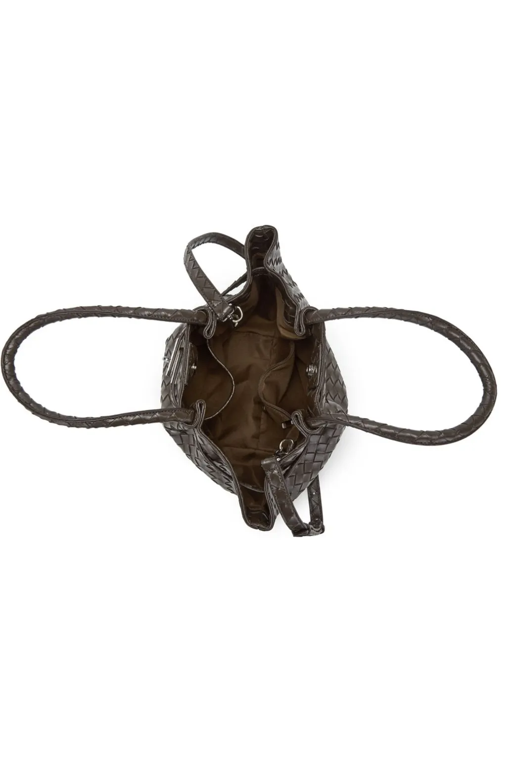 Stor taske fra Noella i mørkebrun med flettet mønster. Tasken har to håndtag og en aftagelig skulderrem.