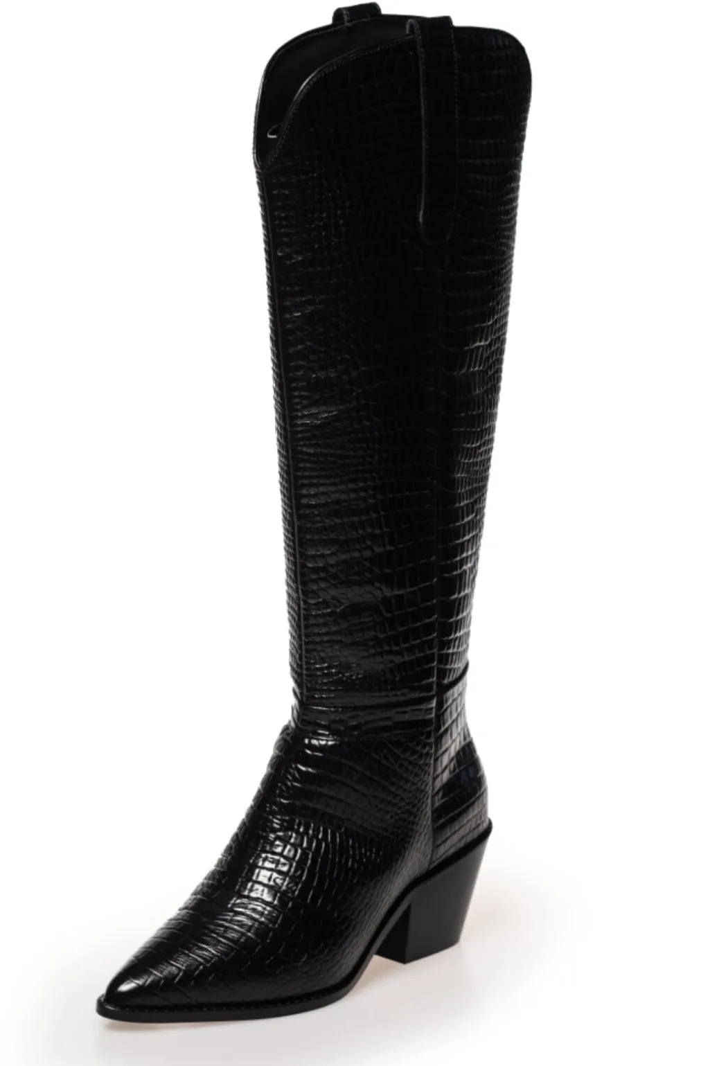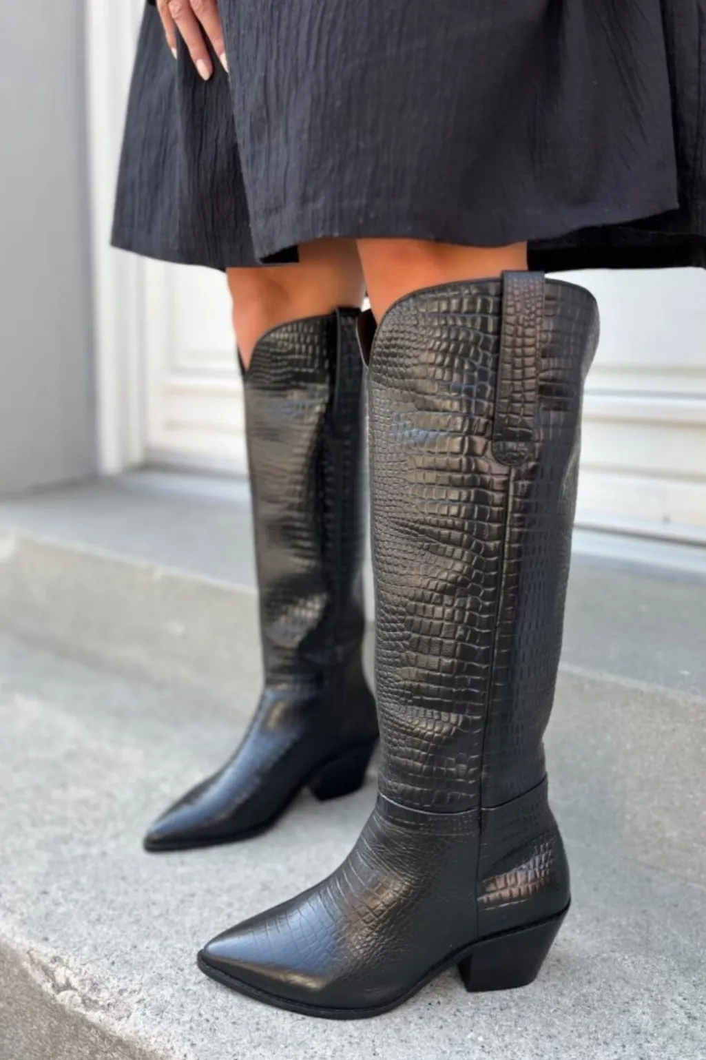 Sorte knæhøje støvler fra Copenhagen Shoes med krokodillemønster i læder. Støvlerne har spids tå og en mellemhøj blokhæl med fleksibel gummisål.